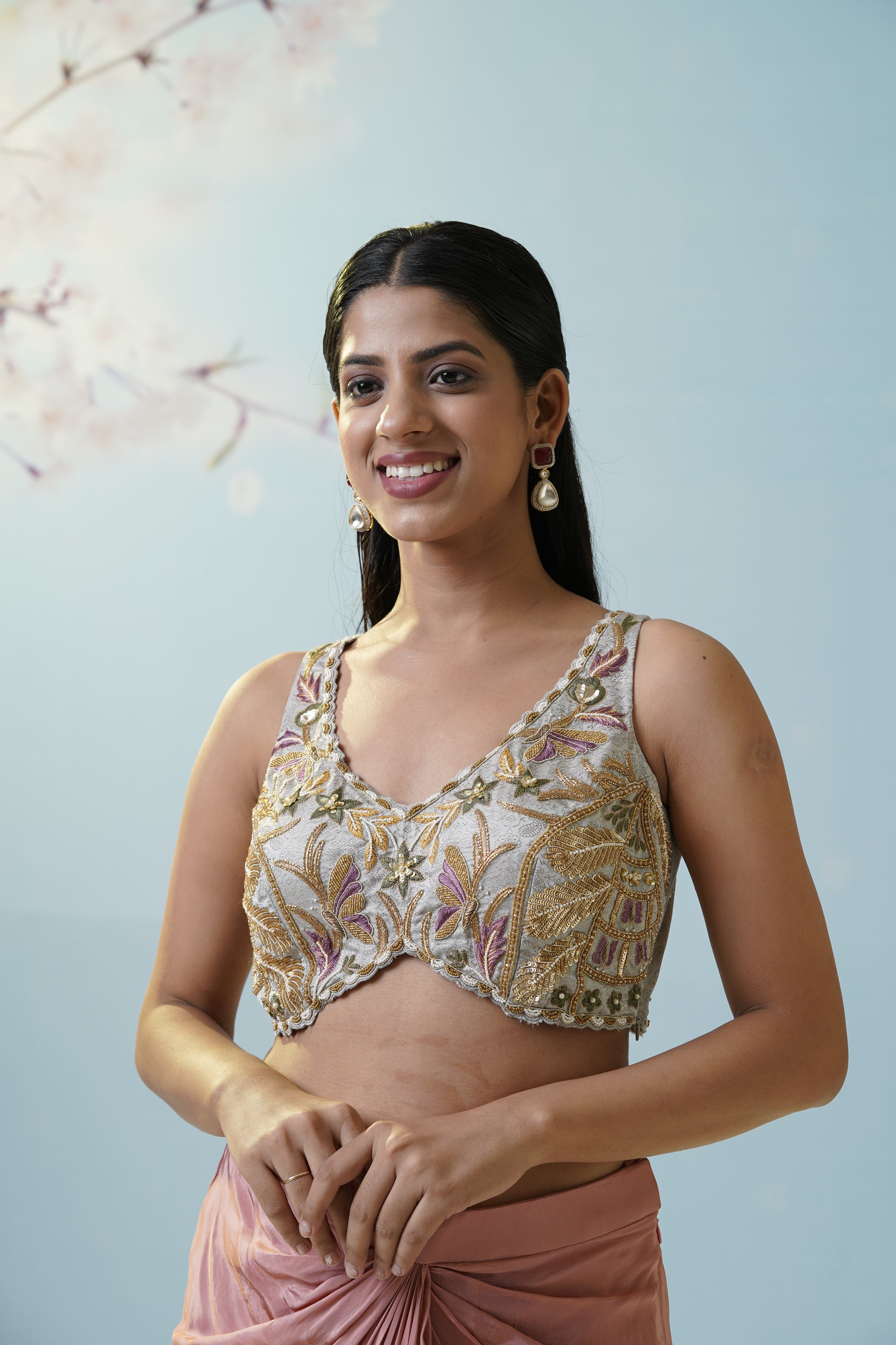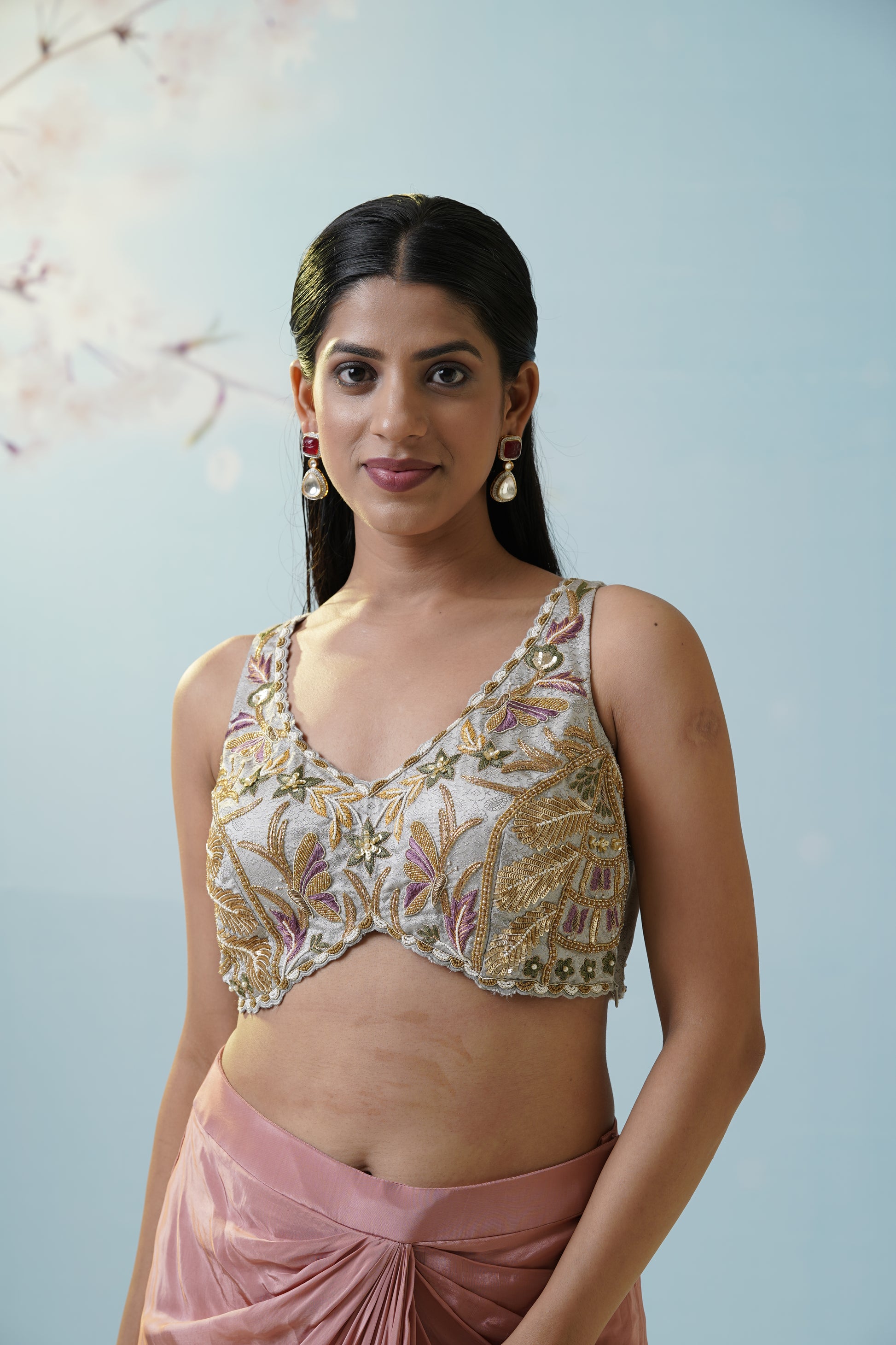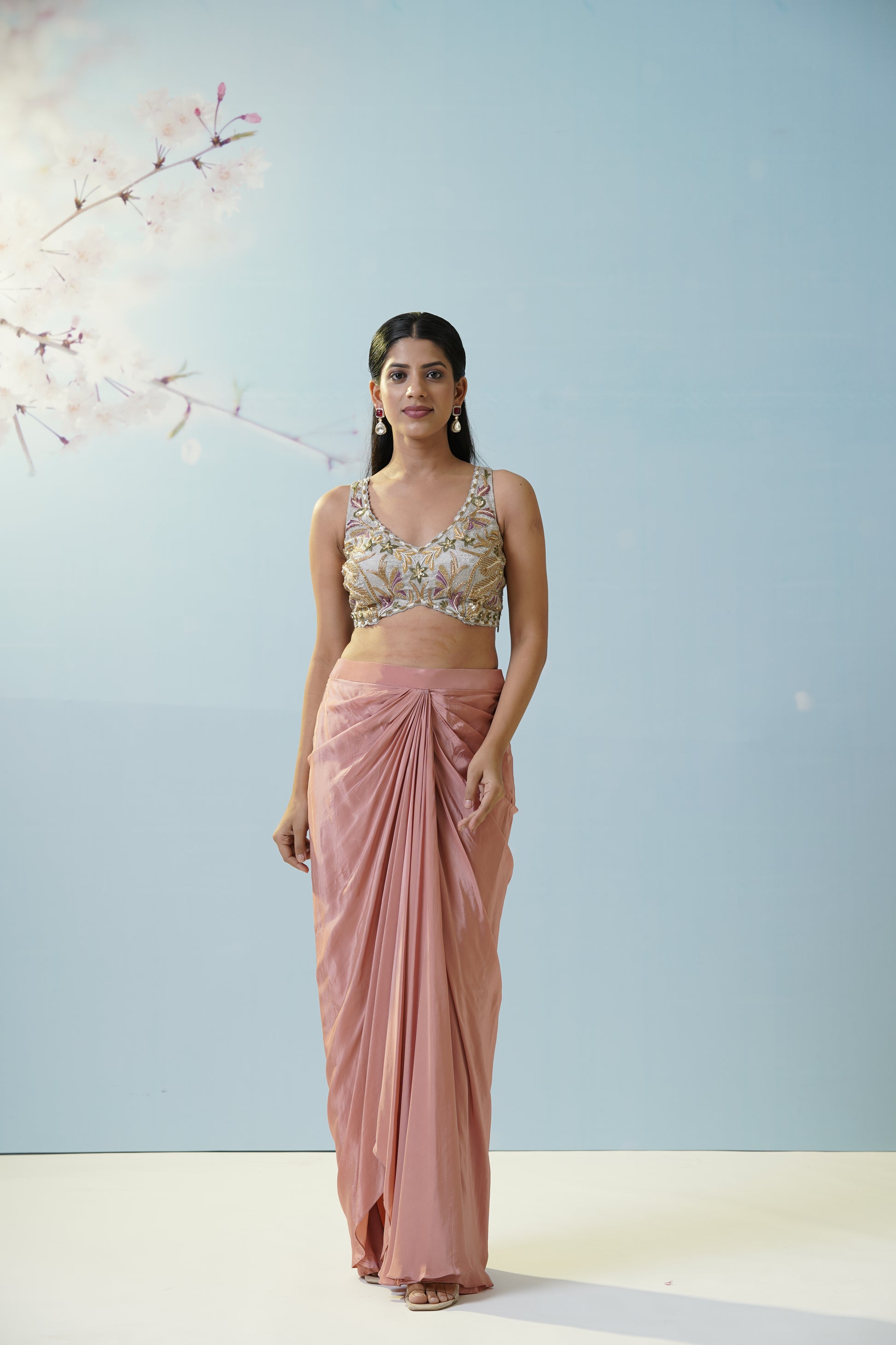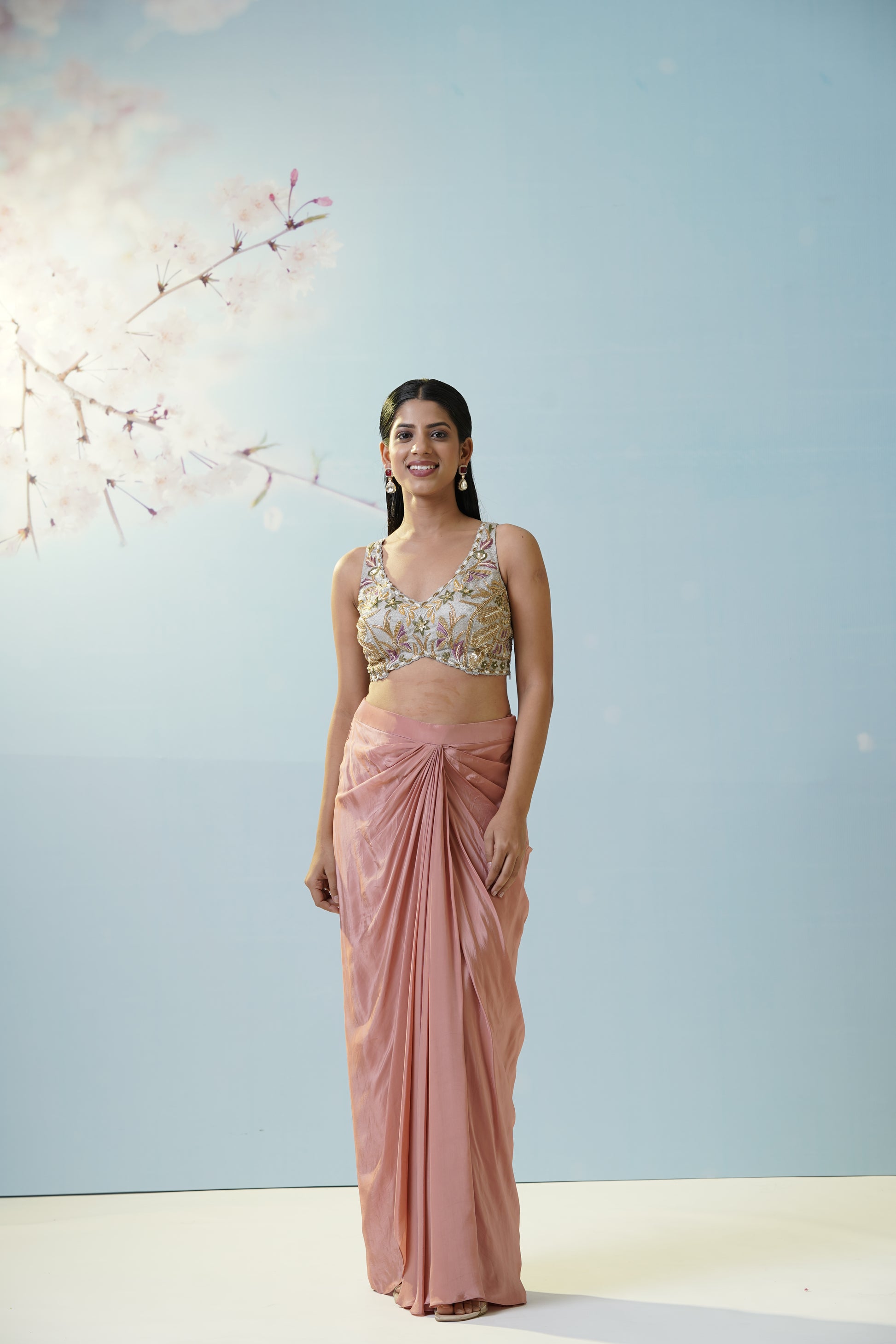 Contemporary blush pink saree with a ruched drape and ornate silver-gold blouse, versatile for wedding brunches or stylish cocktail evenings. The soft blush hue brings timeless romance to every celebration. The gentle sheen and ruched details give a modern twist to tradition, allowing effortless confidence with every step. Designed to flatter any body shape, the draped silhouette delivers elegance with a fresh, youthful edge. Complete the look with pearl drop earrings and soft, dewy makeup for a harmonious appearance.