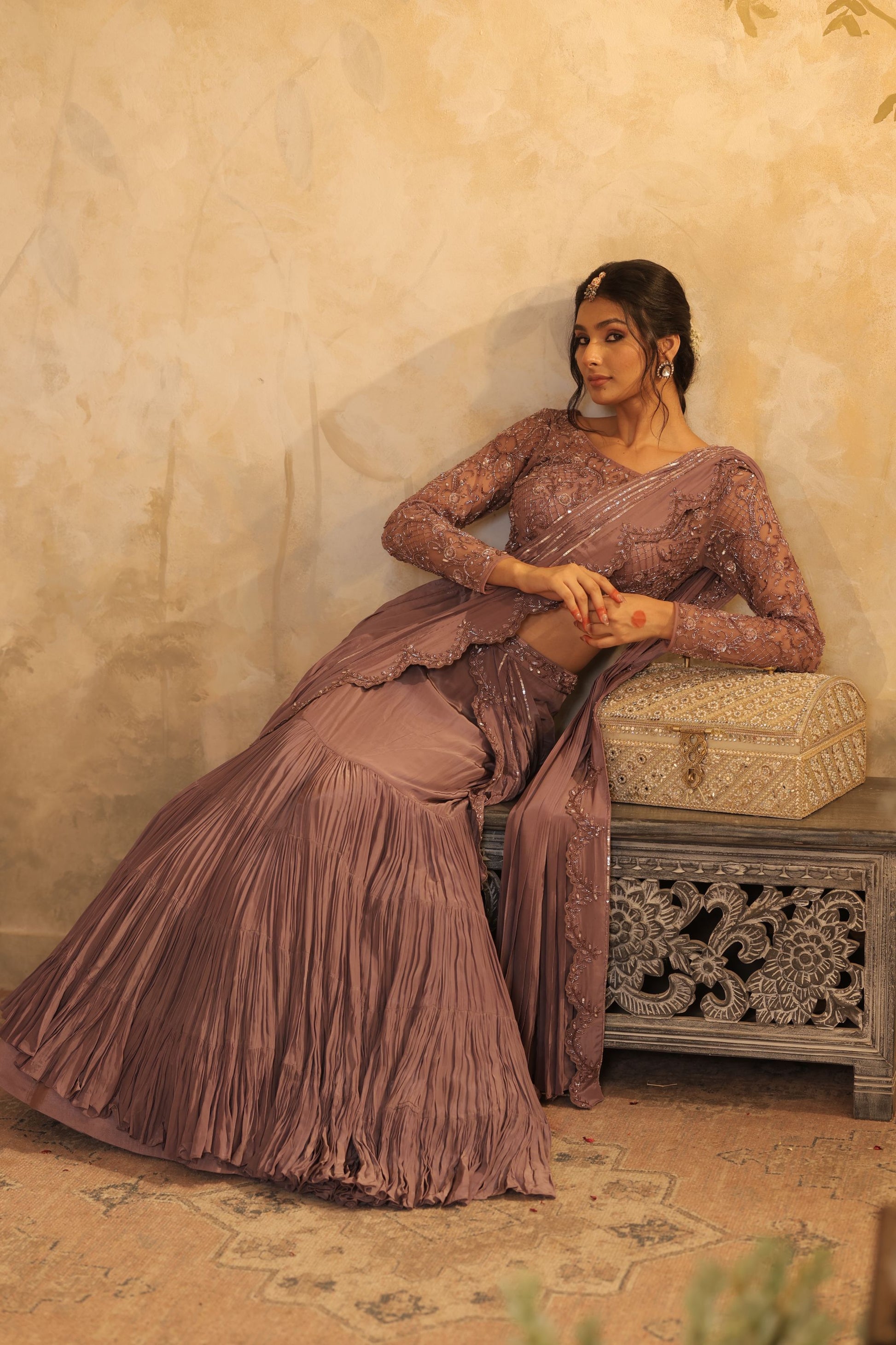 Make a glamorous statement in this lavender saree gown, featuring shimmering sequin embroidery and pleated textures. The graceful silhouette blends modern flair with traditional elegance, perfect for evening celebrations and special occasions.