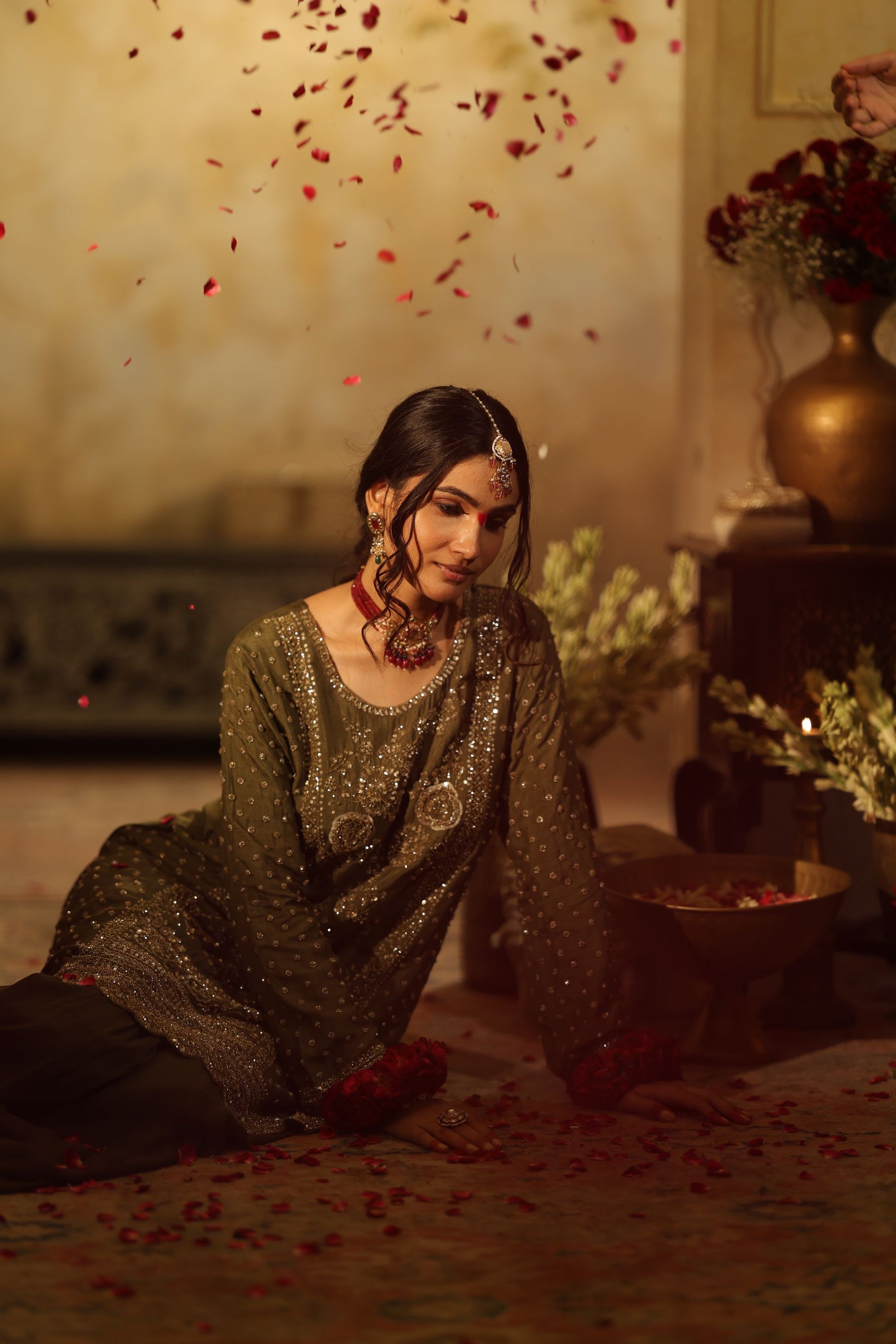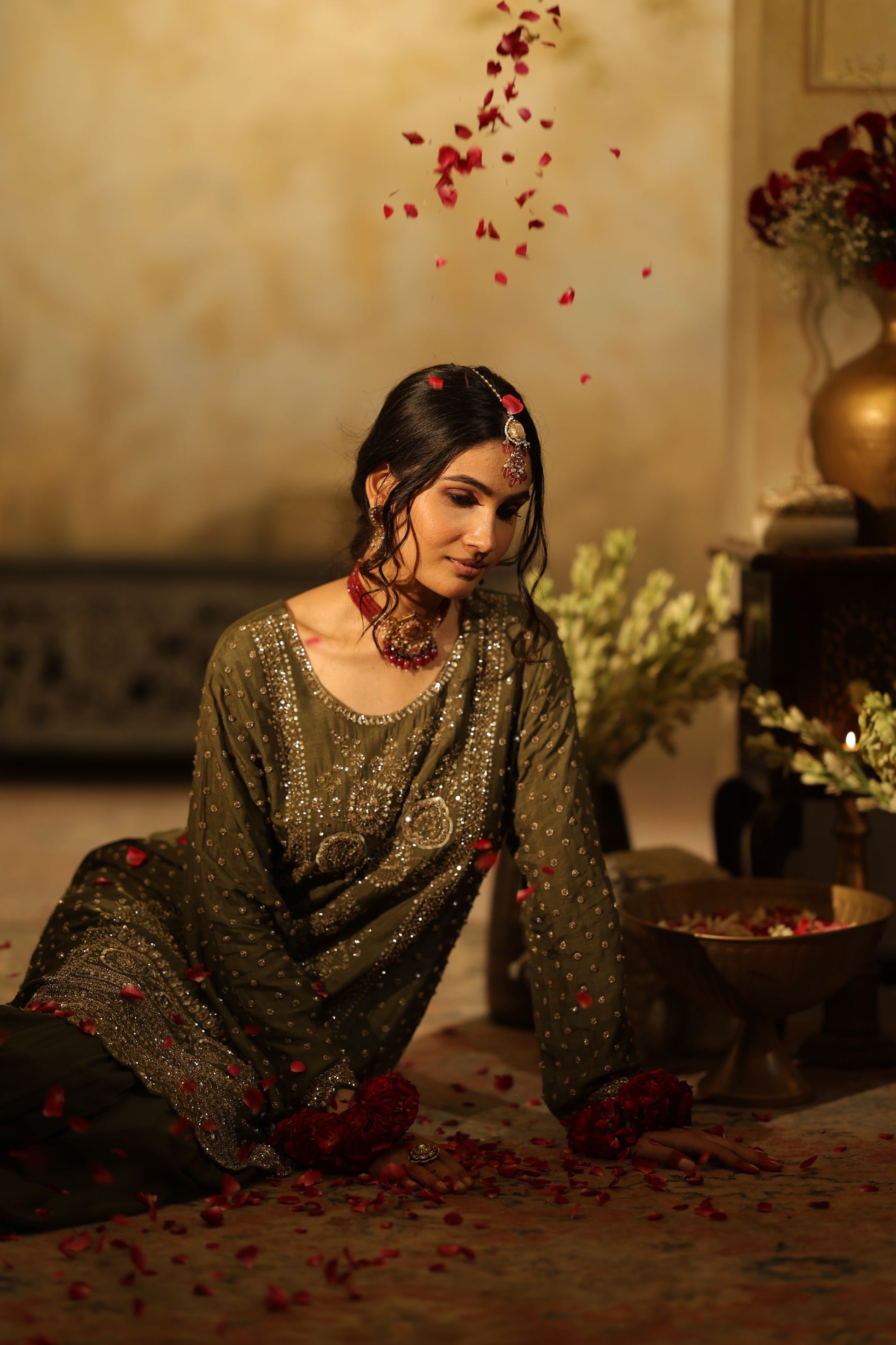 Step into subtle opulence with this olive green kurta set, featuring detailed threadwork and minimal embellishments that add a regal allure. Artistic embroidery and rich fabric make this ensemble an elegant choice for festive evenings.