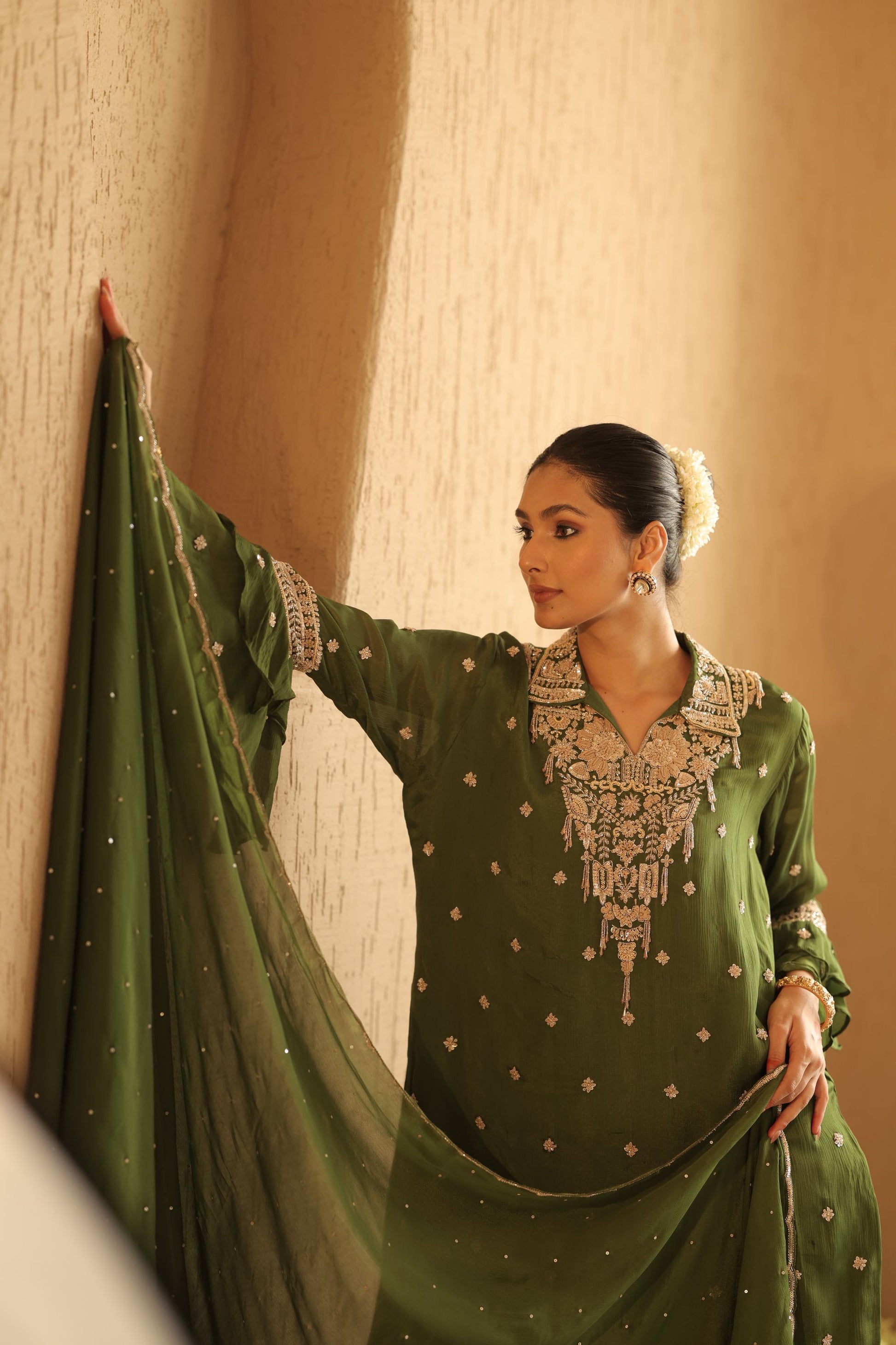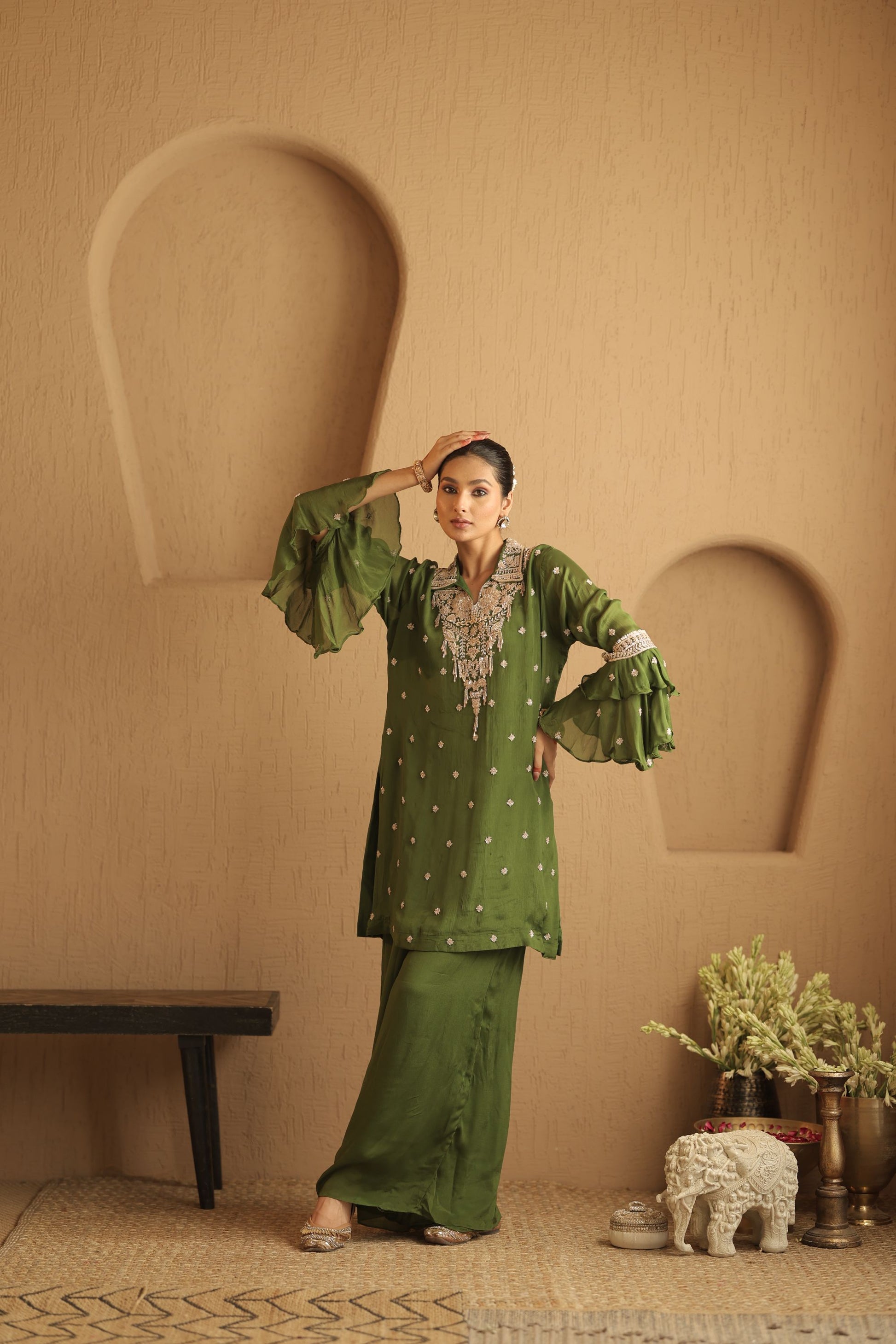Channel modern regality in this emerald green kurta, beautifully highlighted with sparkling silver accents and statement cuffs. The ruffled sleeves and ornate neckline add a touch of vintage allure to this standout ensemble.