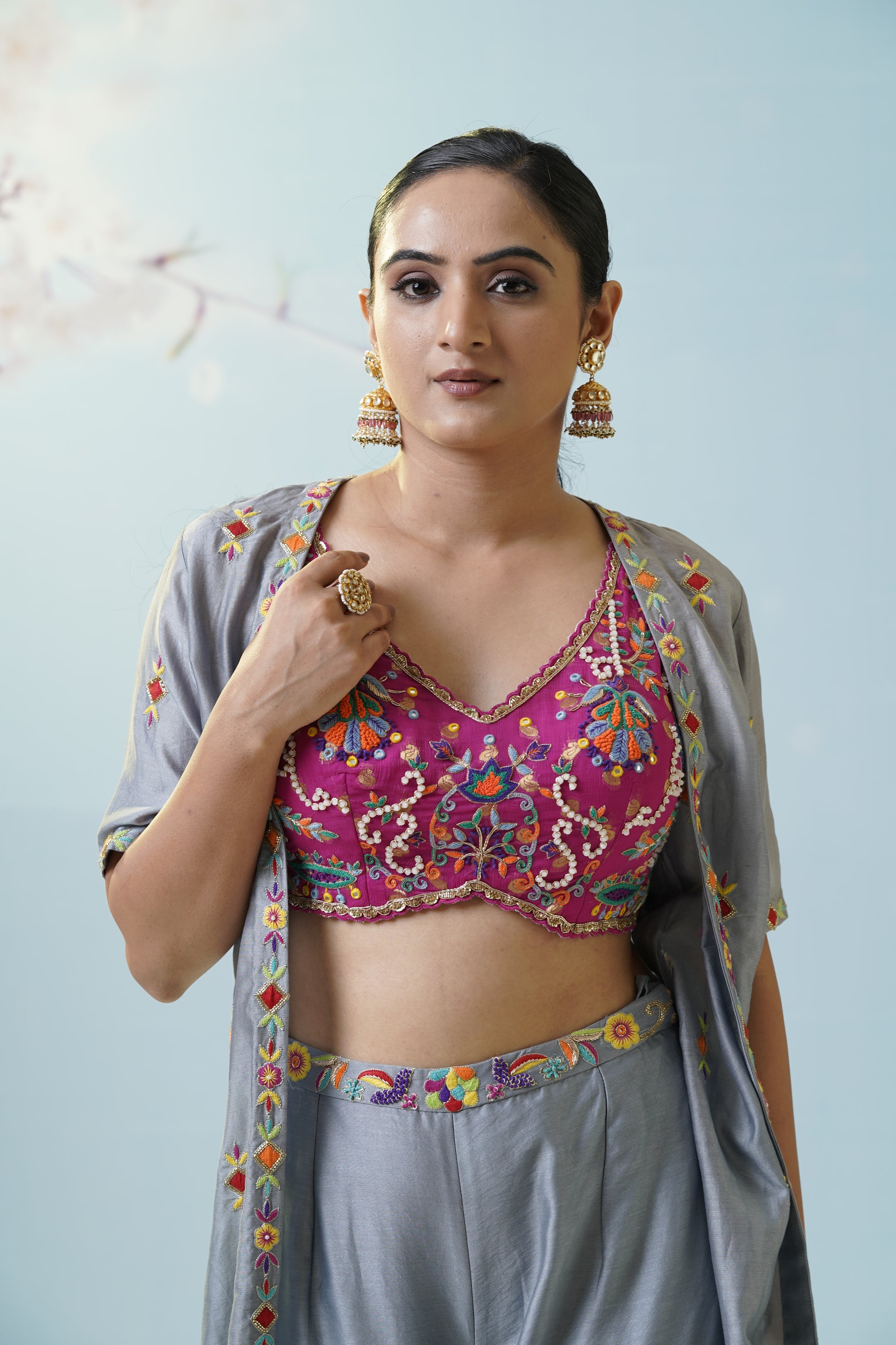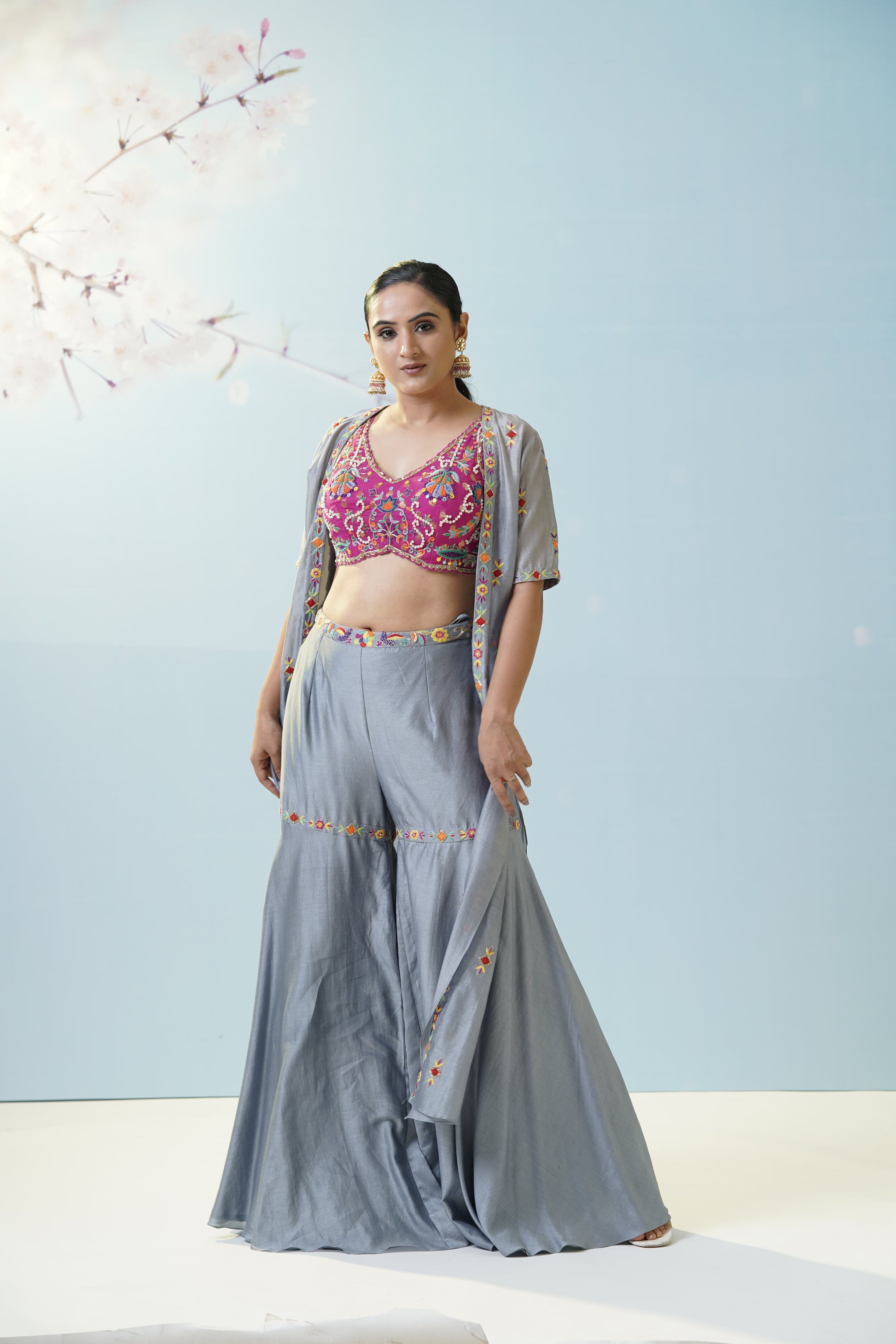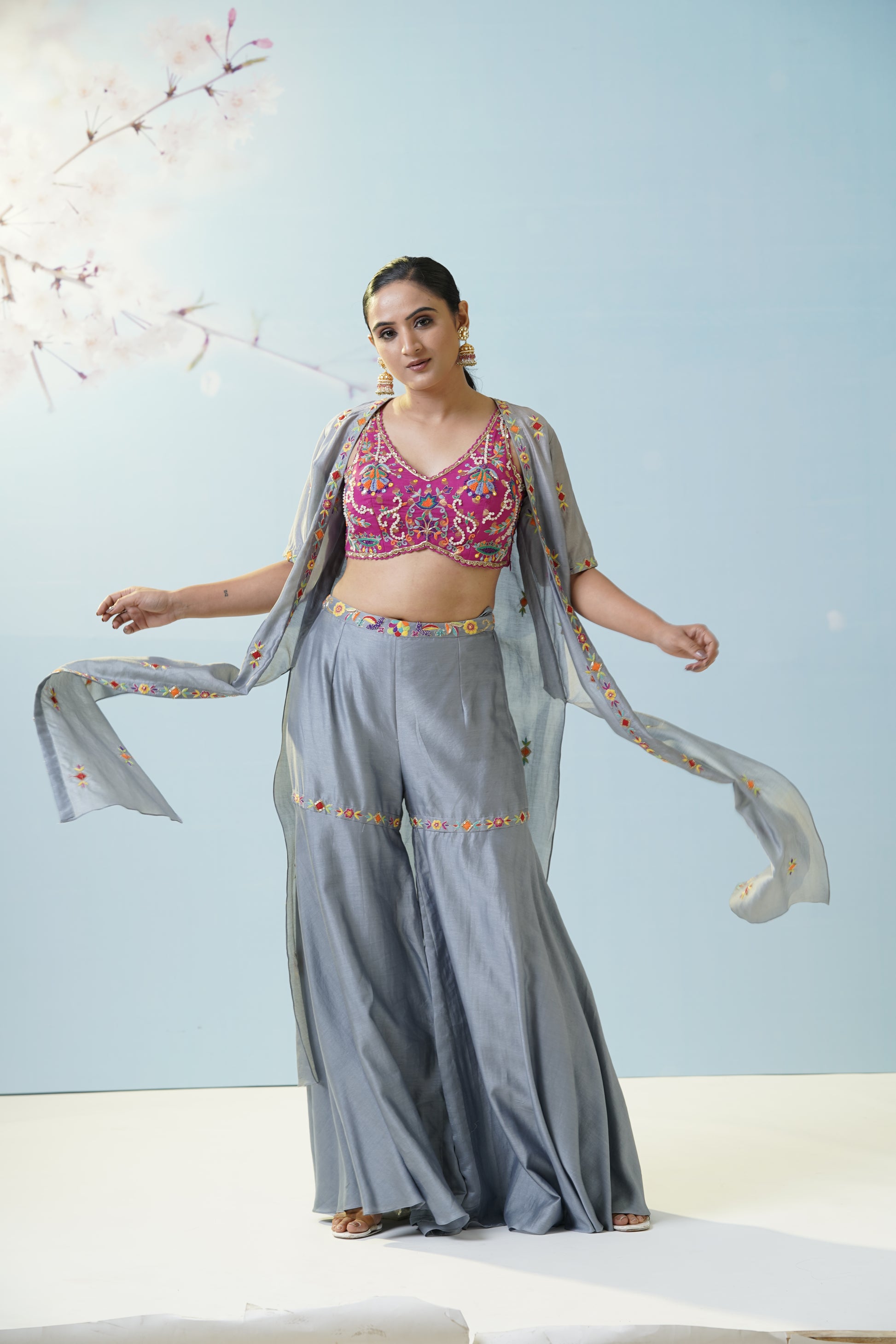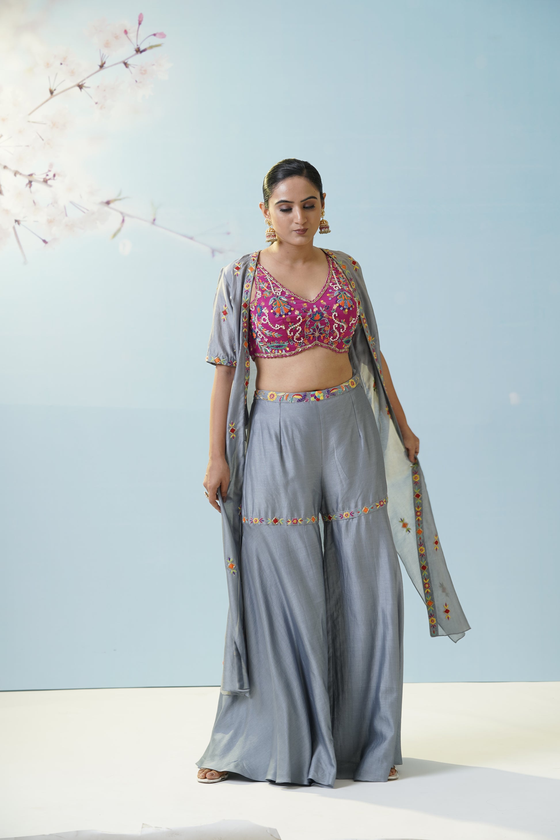 A cool grey flared skirt with delicate embroidered motifs pairs effortlessly with a magenta crop top and a sheer, flowy jacket for artistic contrast and versatility. Let playful fusion and fresh colors set your style apart. Fine details add visual intrigue, making this set a canvas for creativity, movement, and personal flair. The muted grey serves as a soft canvas for the lively magenta, creating a modern boho mood. Finish the look with oxidized jewelry to highlight the unique handcrafted aesthetic.