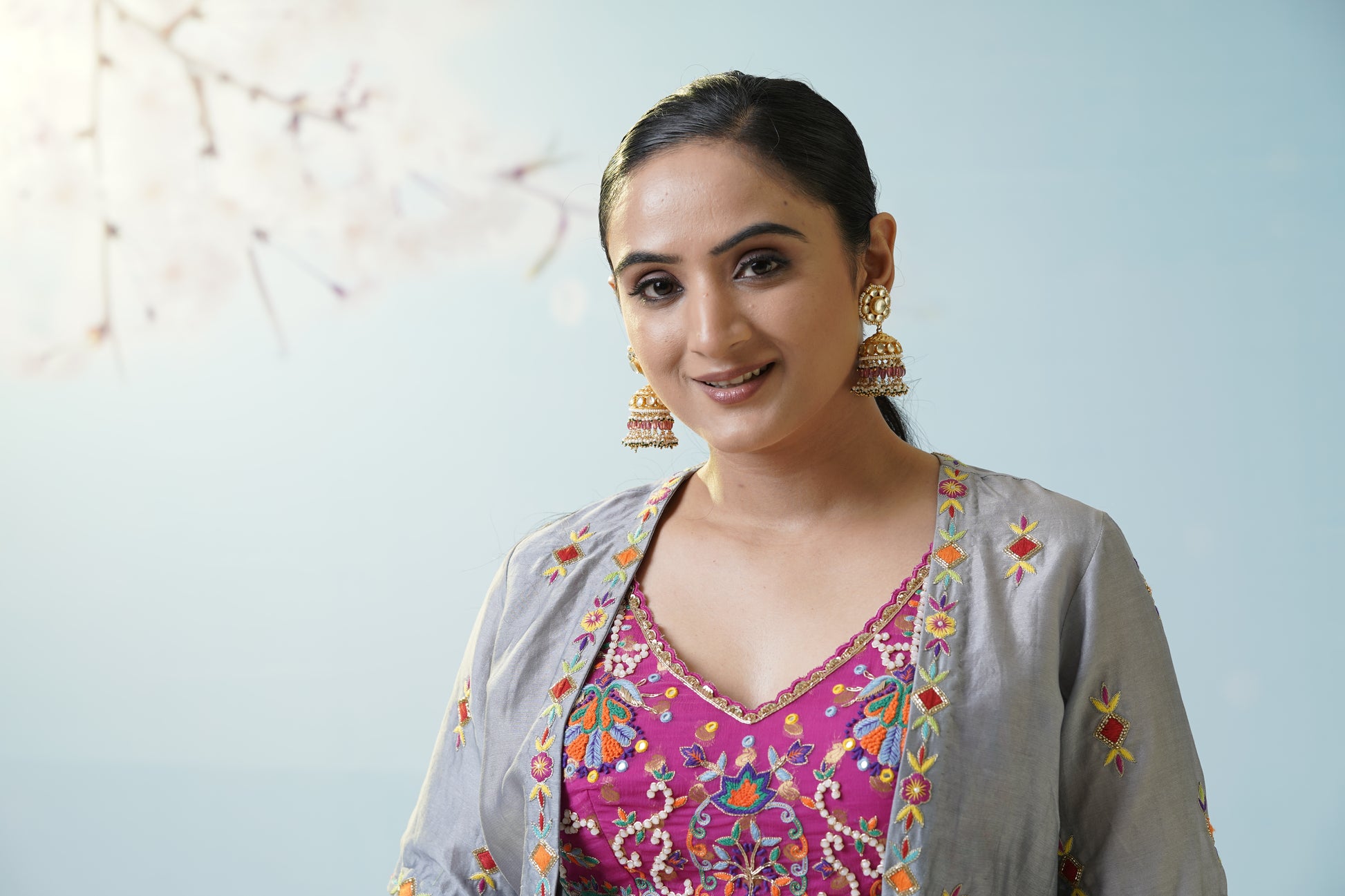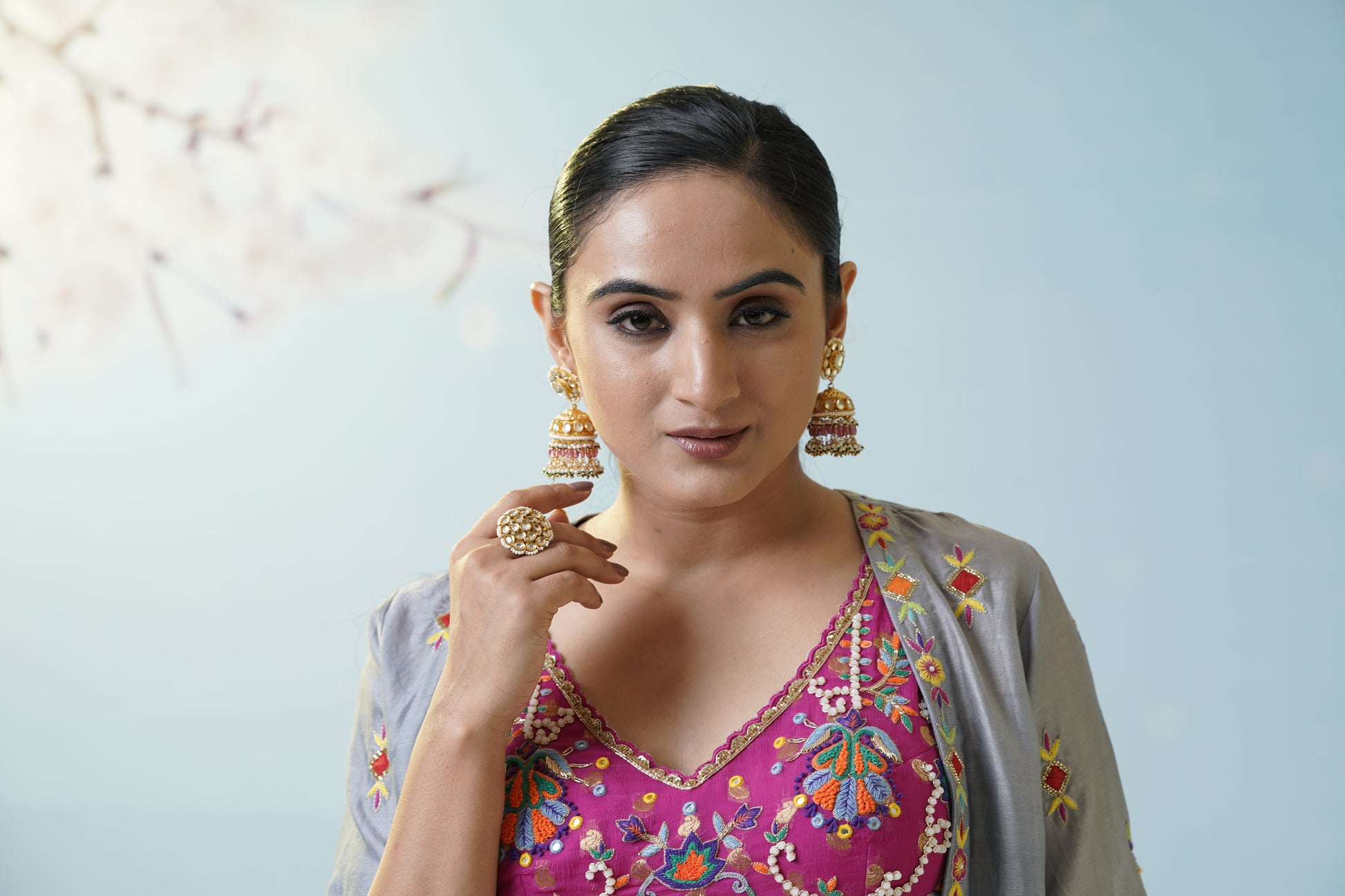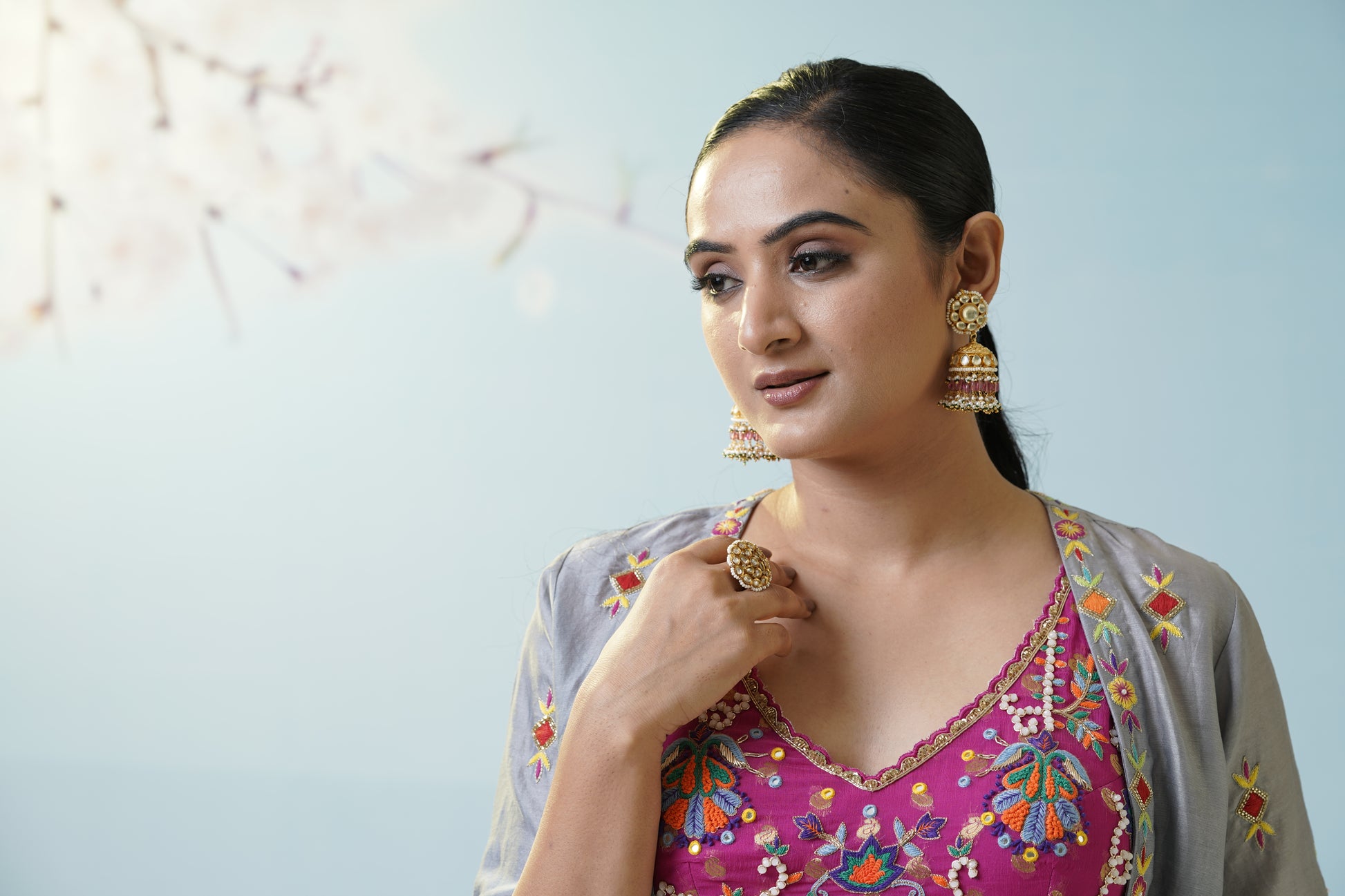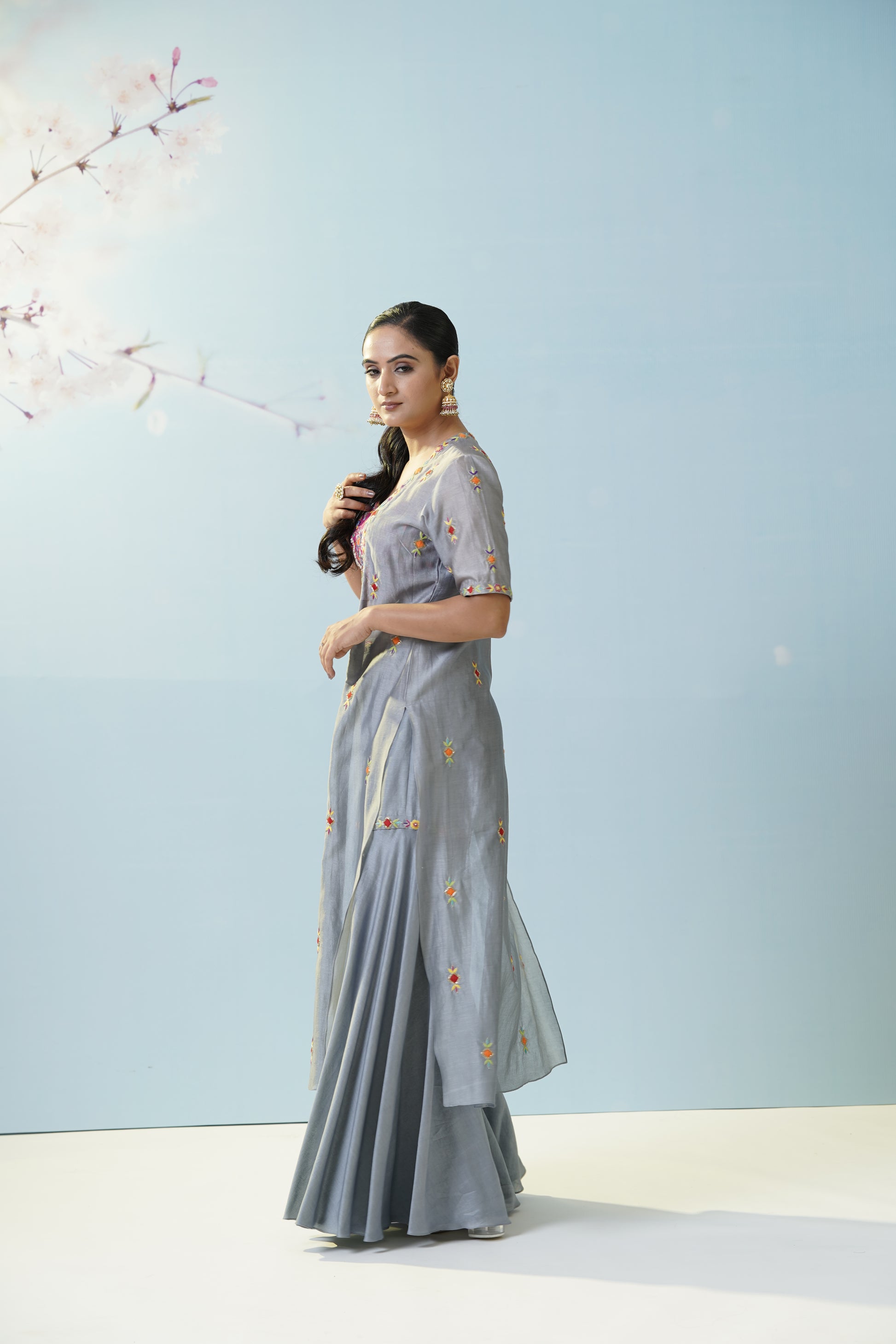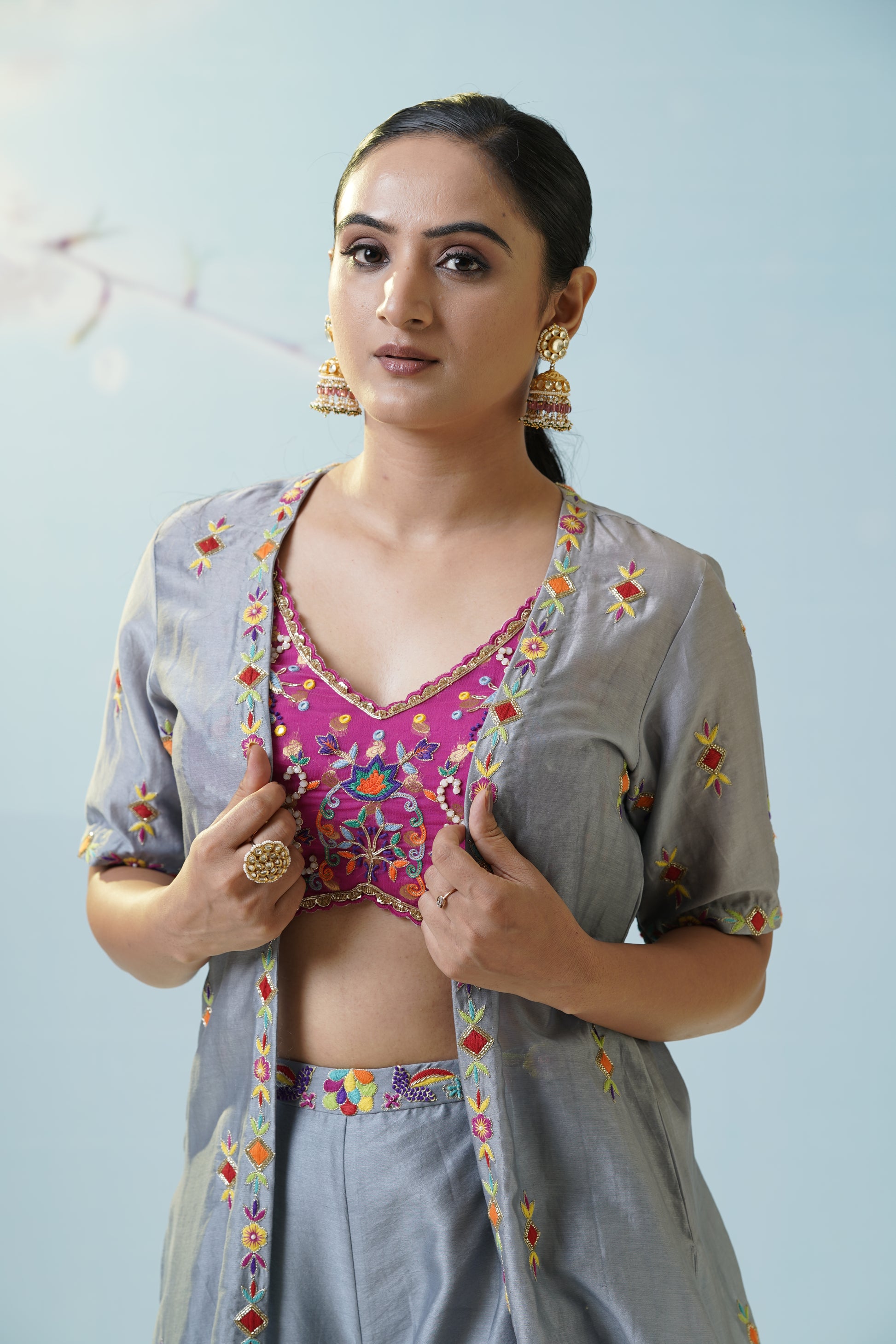 A cool grey flared skirt with delicate embroidered motifs pairs effortlessly with a magenta crop top and a sheer, flowy jacket for artistic contrast and versatility. Let playful fusion and fresh colors set your style apart. Fine details add visual intrigue, making this set a canvas for creativity, movement, and personal flair. The muted grey serves as a soft canvas for the lively magenta, creating a modern boho mood. Finish the look with oxidized jewelry to highlight the unique handcrafted aesthetic.