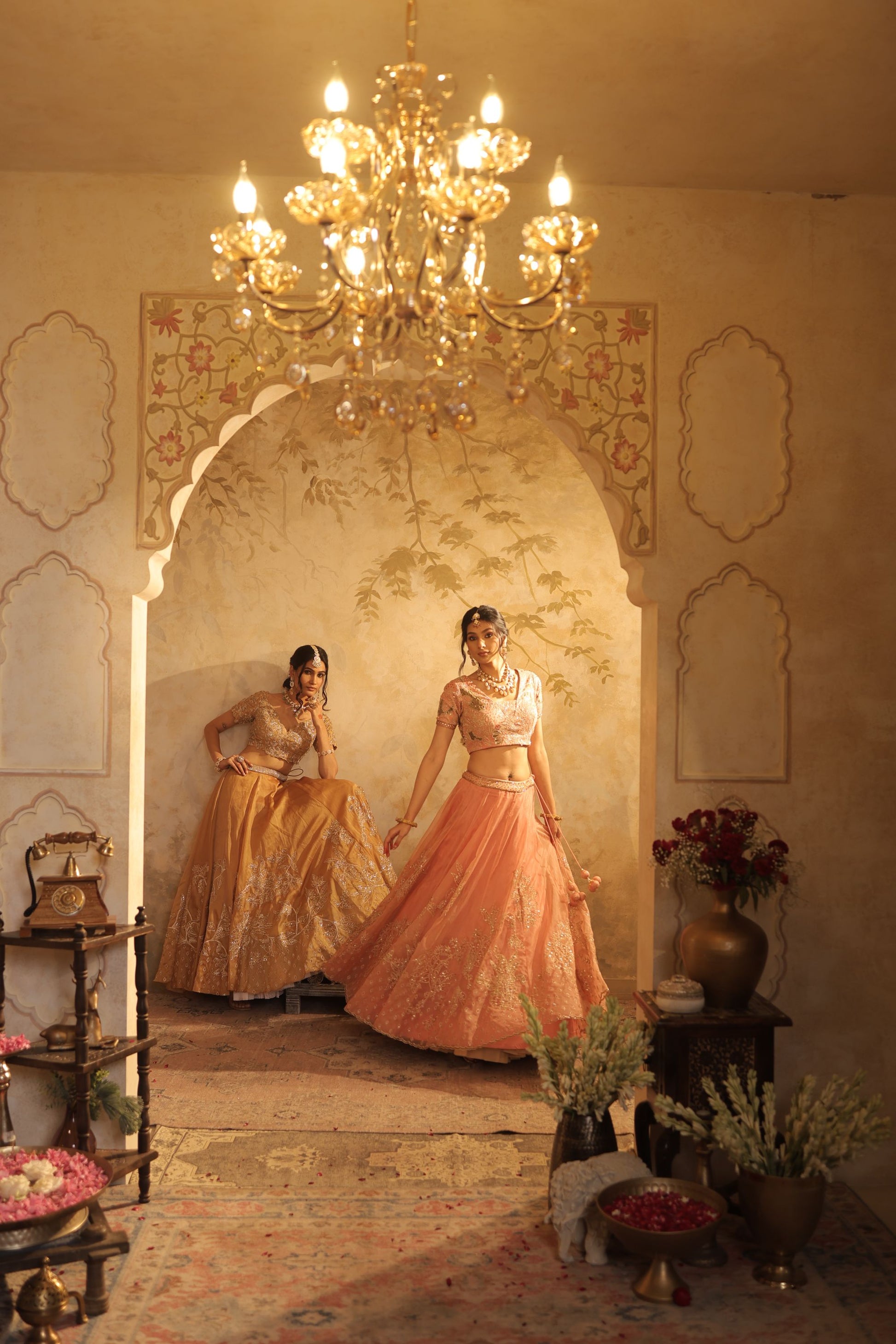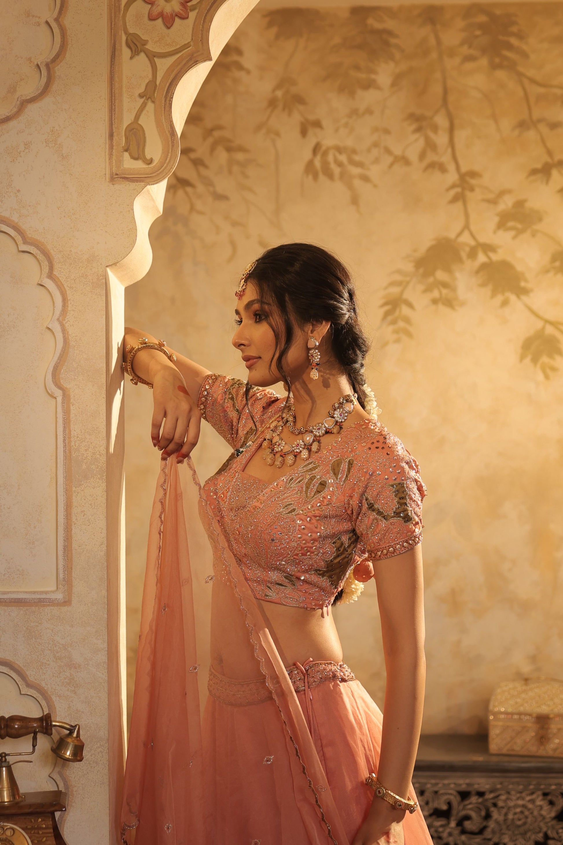 This peach lehenga set shines with whimsical embroidery and a playful drape. The light, twirling skirt and subtly embellished choli beautifully balance tradition with fresh, feminine charm.