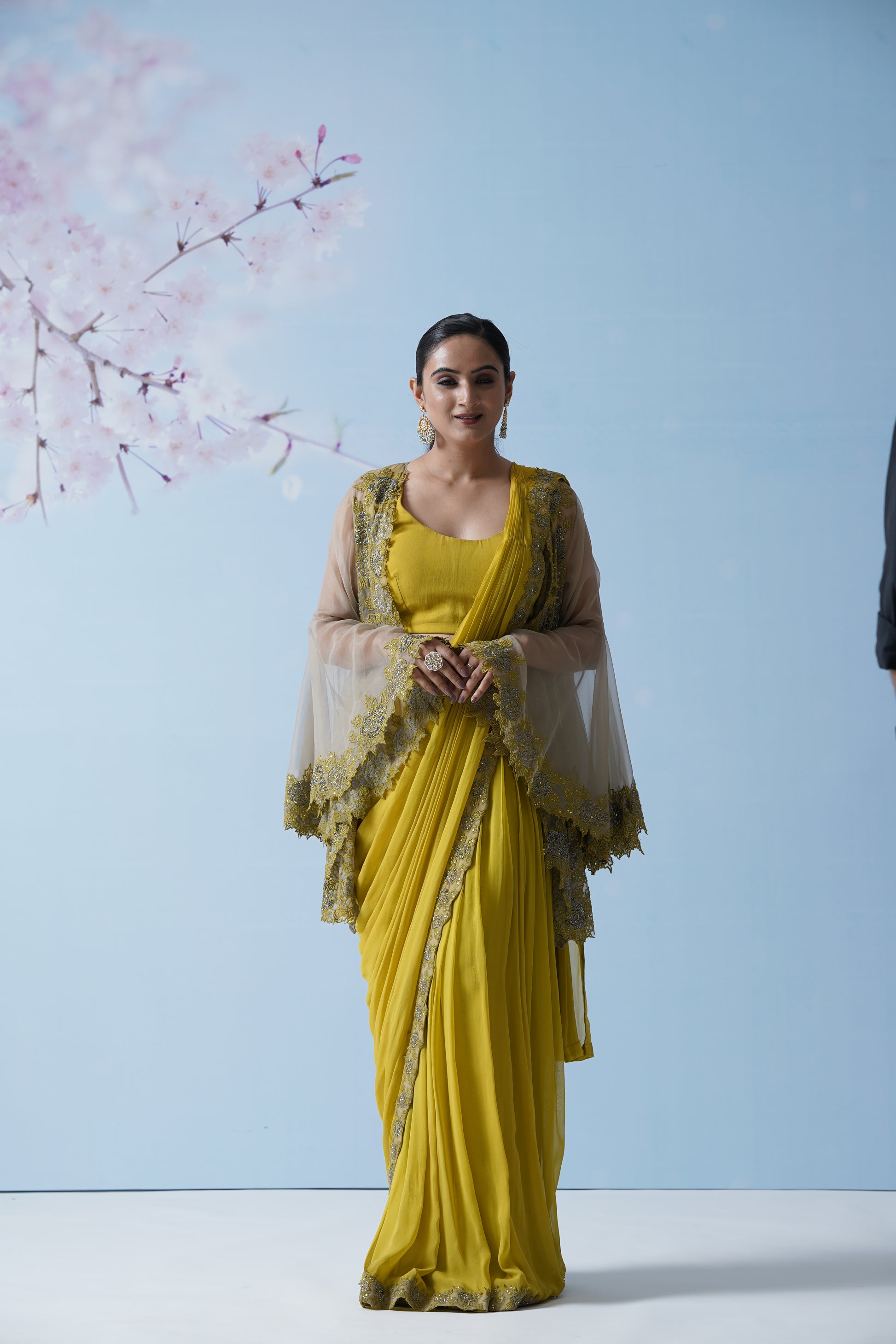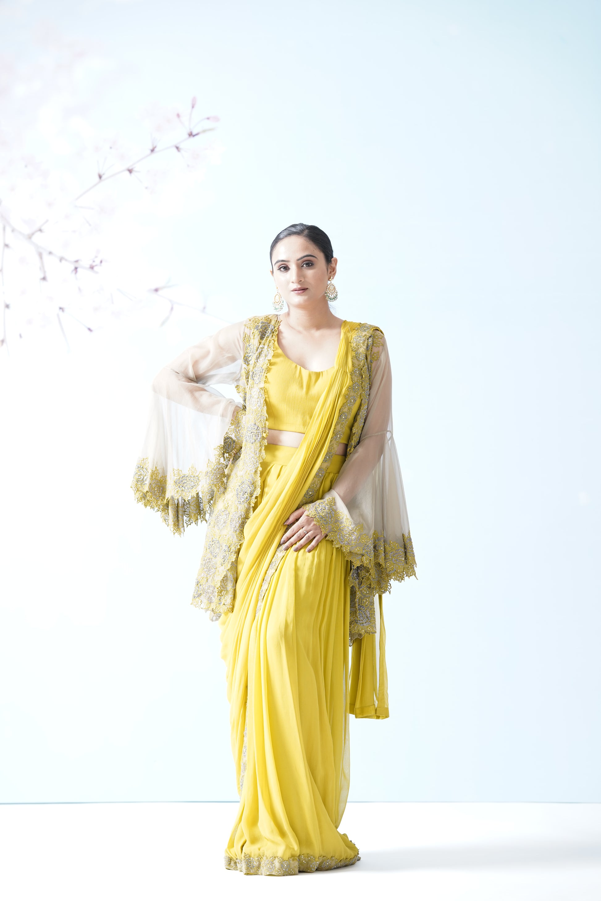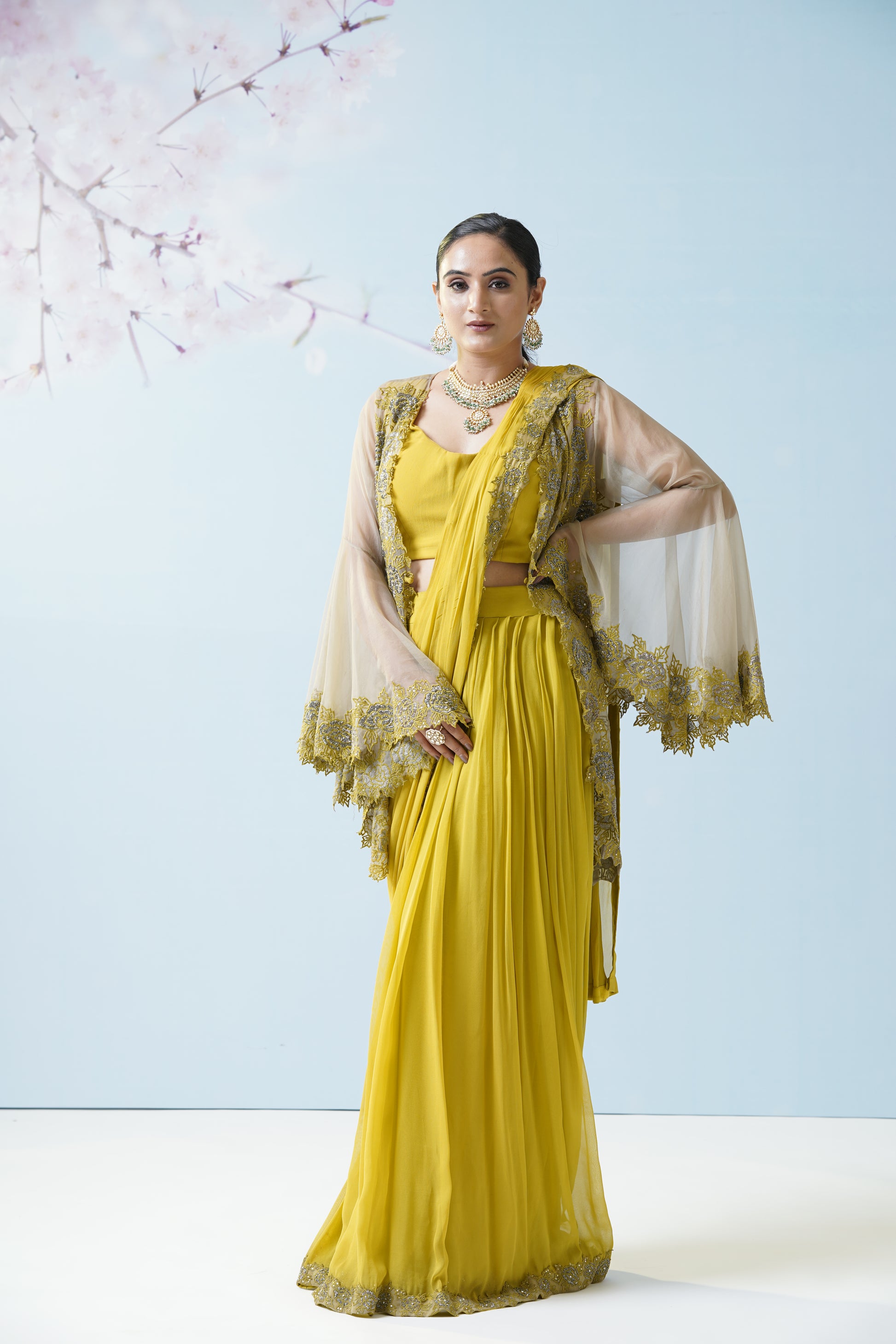 Lemon Yellow Net Saree With Embroidered Blouse