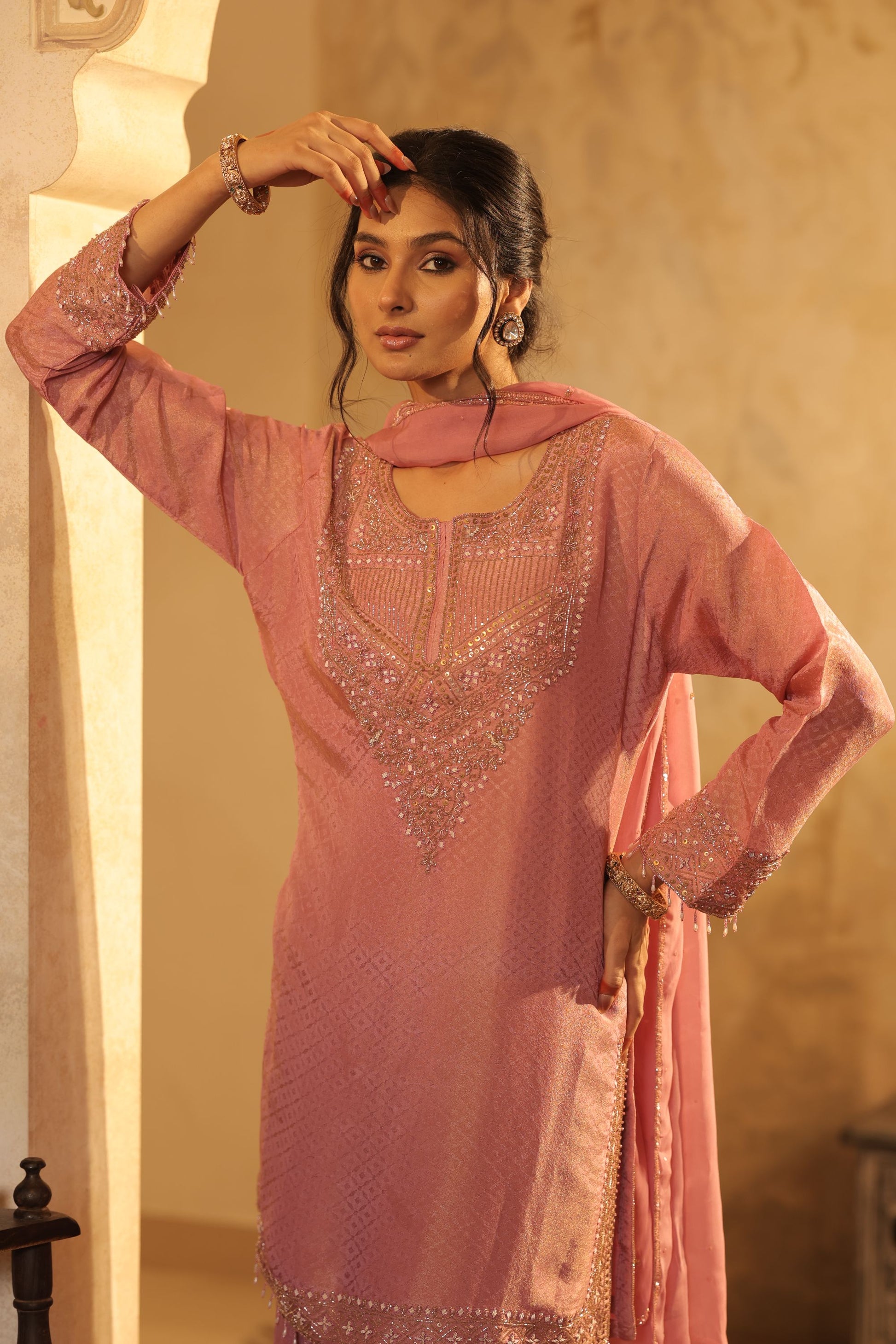 Make an entrance in this blush pink kurta set, featuring a flirtatious silhouette paired with palazzo pants. Graceful embroidery and a light net dupatta add to the neo-traditional appeal—perfect for modern festive celebrations.
