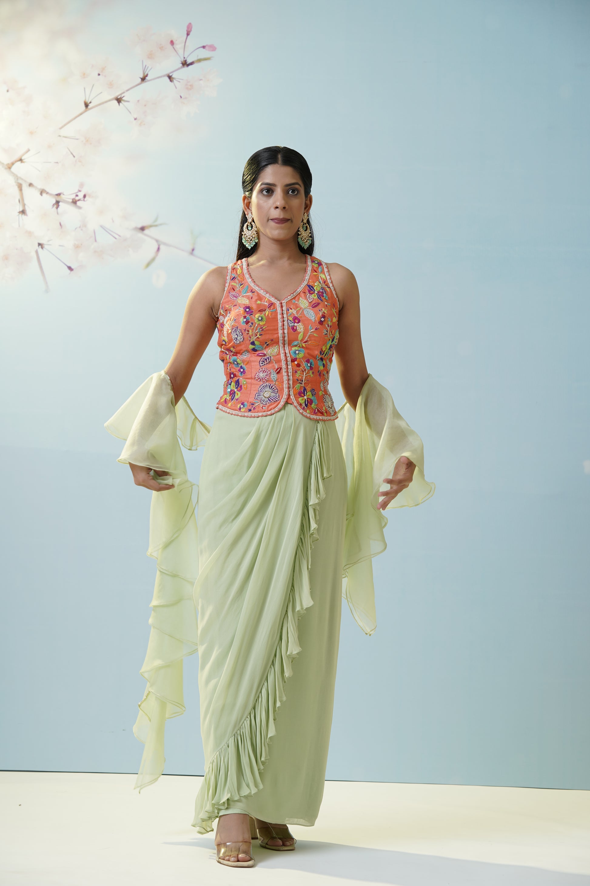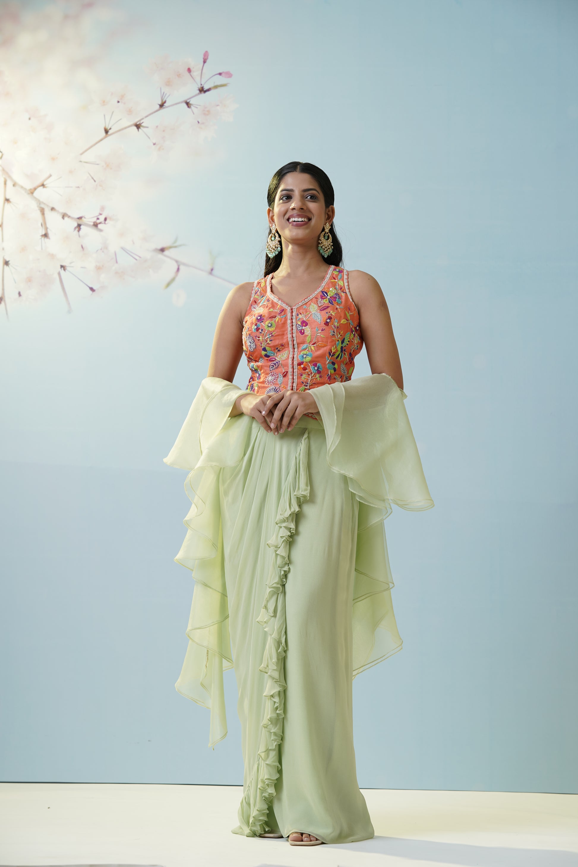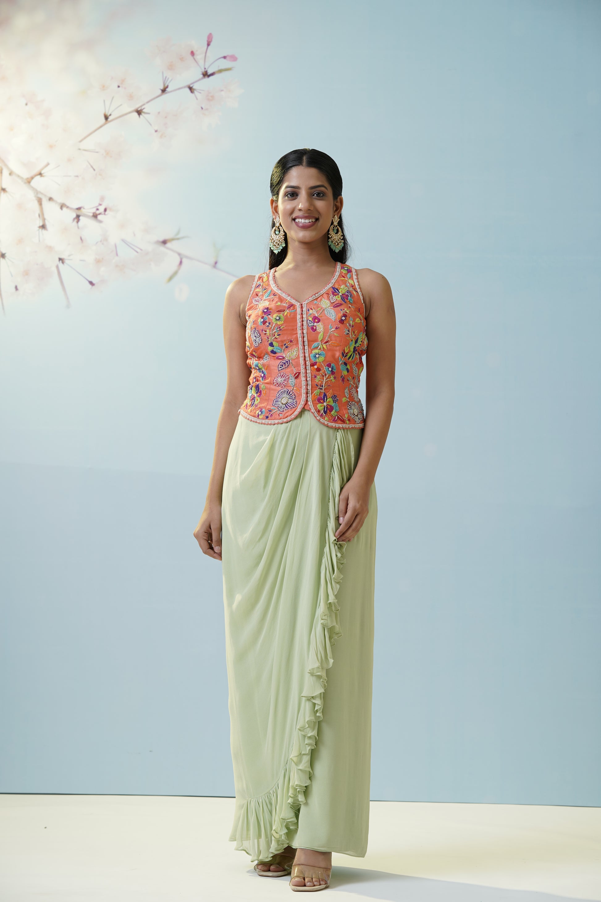 A relaxed aqua dhoti pant set teamed with a bright yellow floral crop top and sheer embellished jacket, merging playful modernity with tradition for mehendi or casual festive gatherings. Move with fluidity and grace while showcasing artistic flair. The sheer overlay adds delicacy to the look, while the vibrant colors boost the energy and fun—perfect for dancing the night away. The flowy pants offer maximum comfort, making this a favorite for laidback yet stylish affairs. Accentuate the quirky silhouette with boho earrings and sleek hair for a chic, effortless finish.