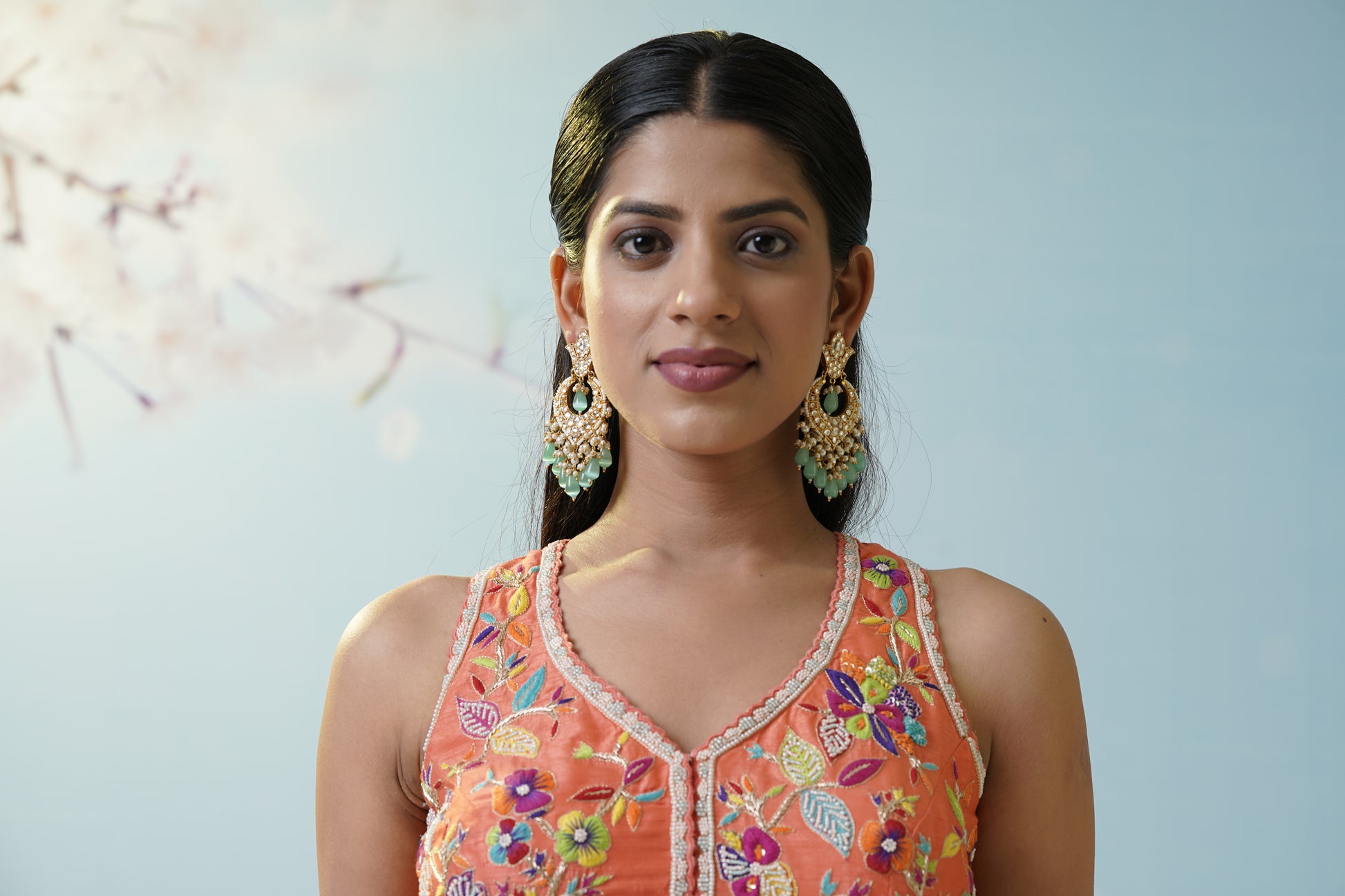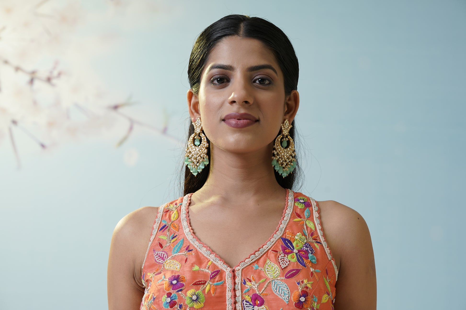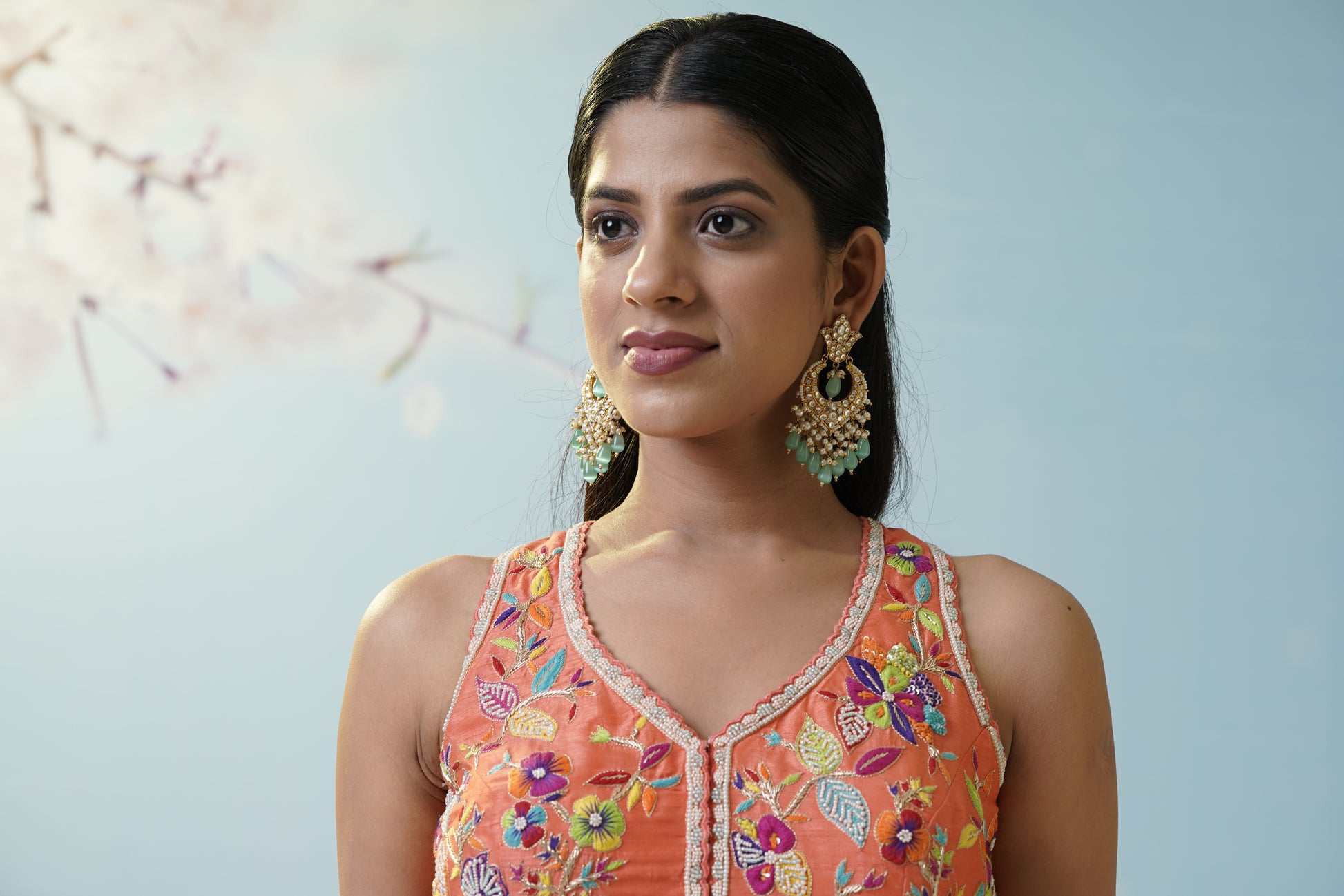 A relaxed aqua dhoti pant set teamed with a bright yellow floral crop top and sheer embellished jacket, merging playful modernity with tradition for mehendi or casual festive gatherings. Move with fluidity and grace while showcasing artistic flair. The sheer overlay adds delicacy to the look, while the vibrant colors boost the energy and fun—perfect for dancing the night away. The flowy pants offer maximum comfort, making this a favorite for laidback yet stylish affairs. Accentuate the quirky silhouette with boho earrings and sleek hair for a chic, effortless finish.
