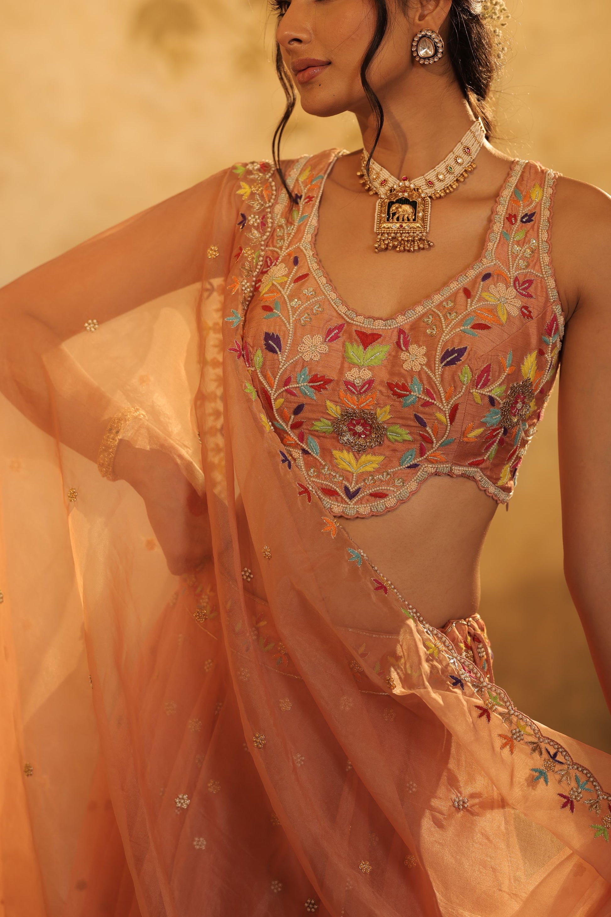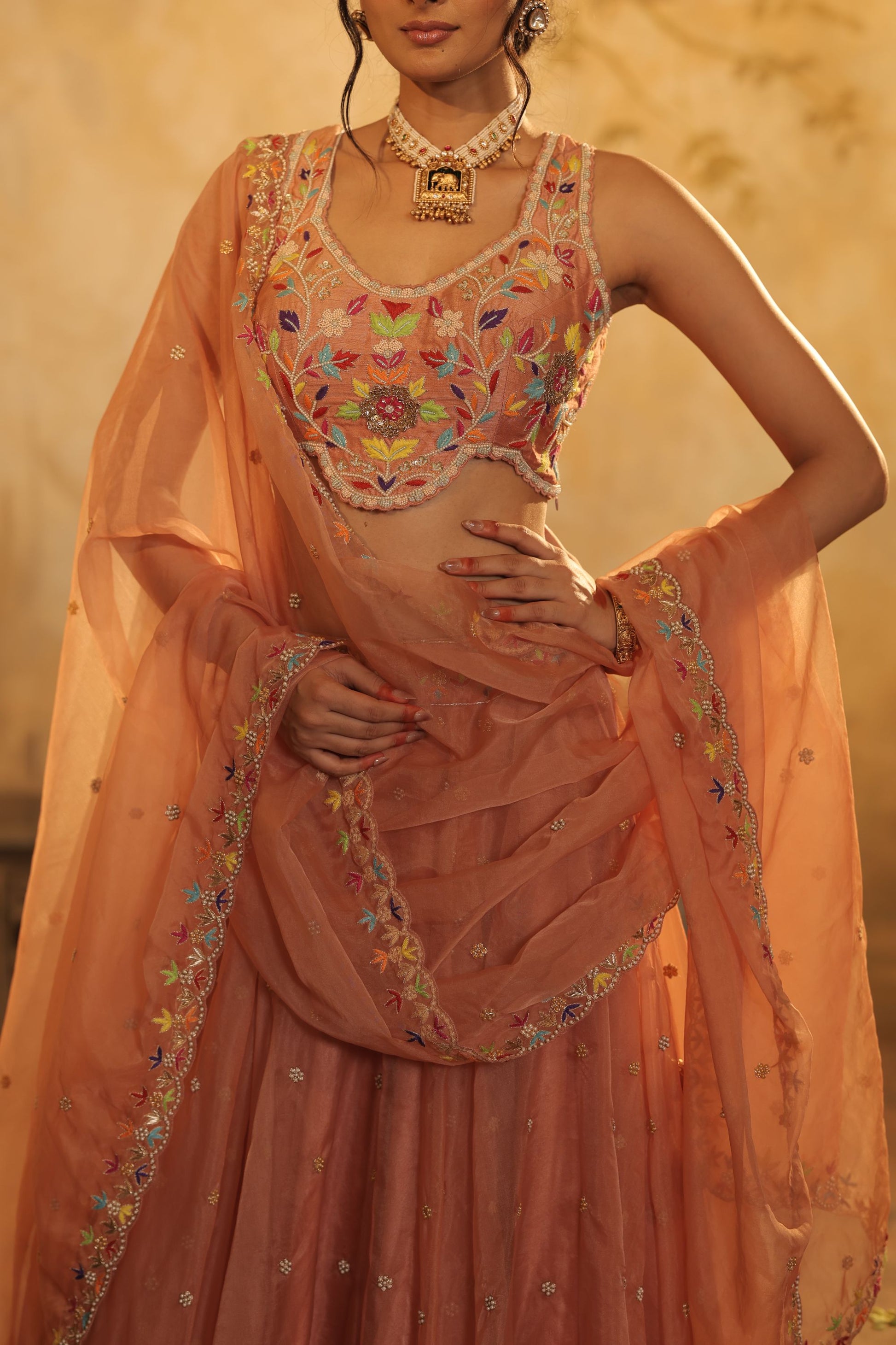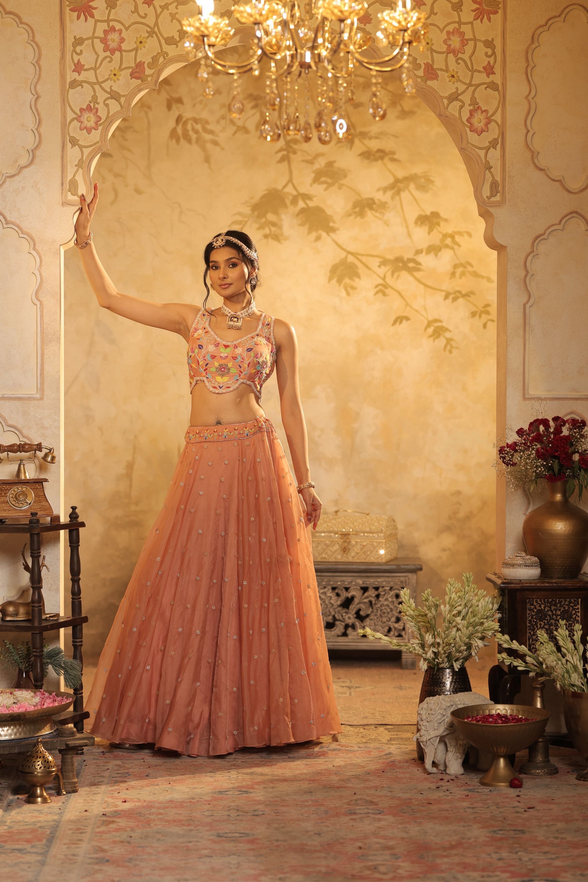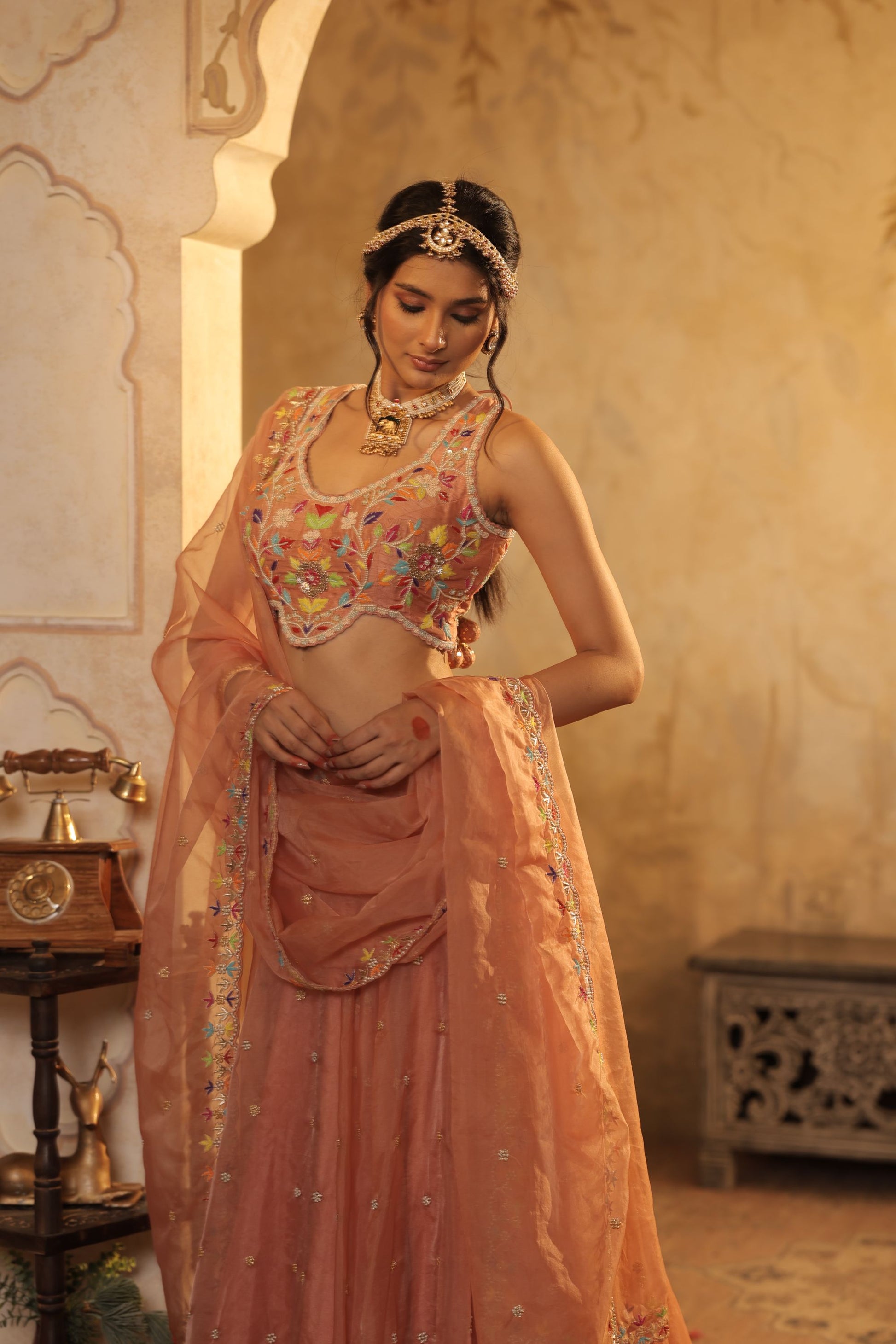 Delicate and dreamy, this peach embroidered lehenga brings together floral motifs and pastel hues. The lightweight fabric ensures fluid movement, while the detailed blouse and dupatta add festive charm.
