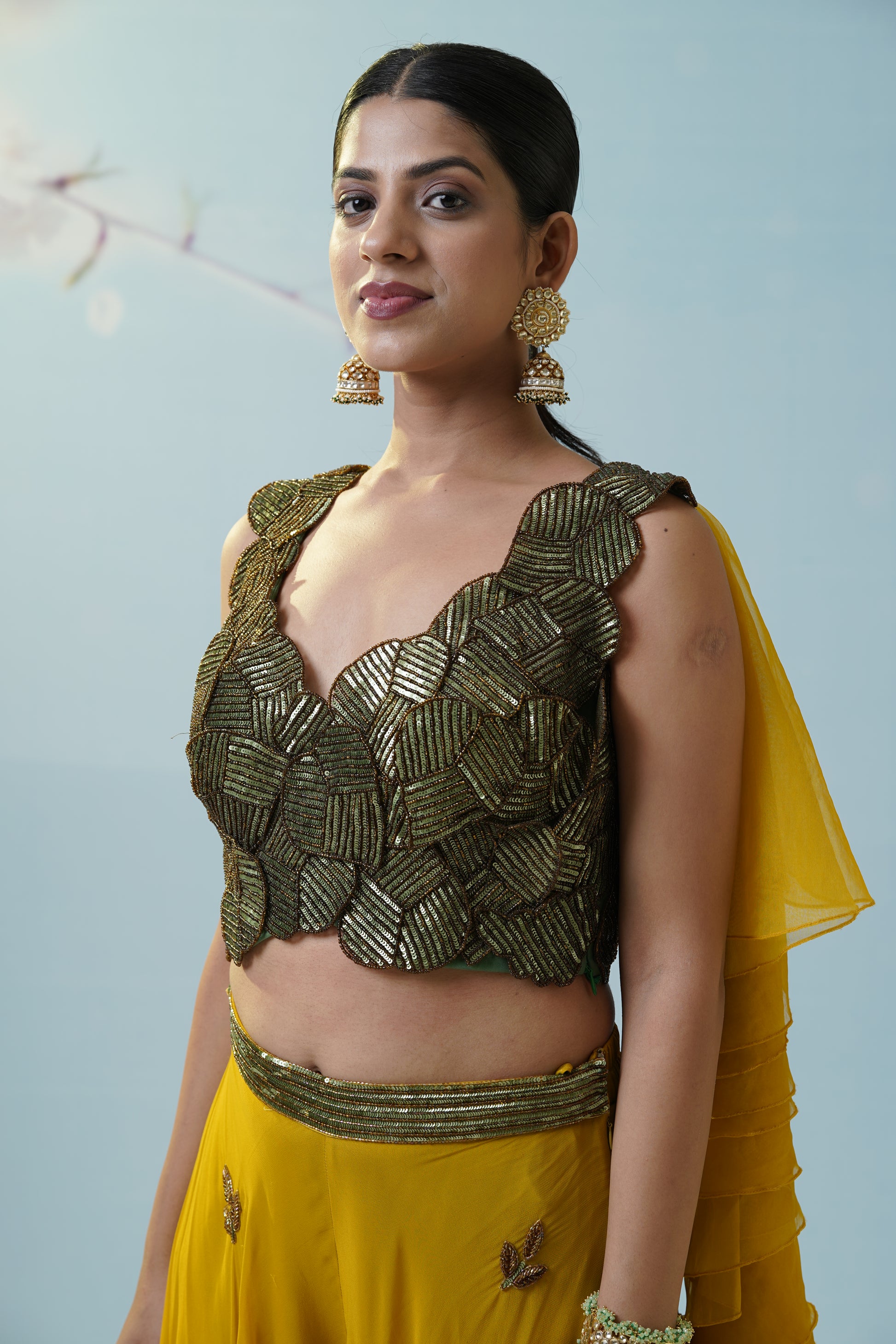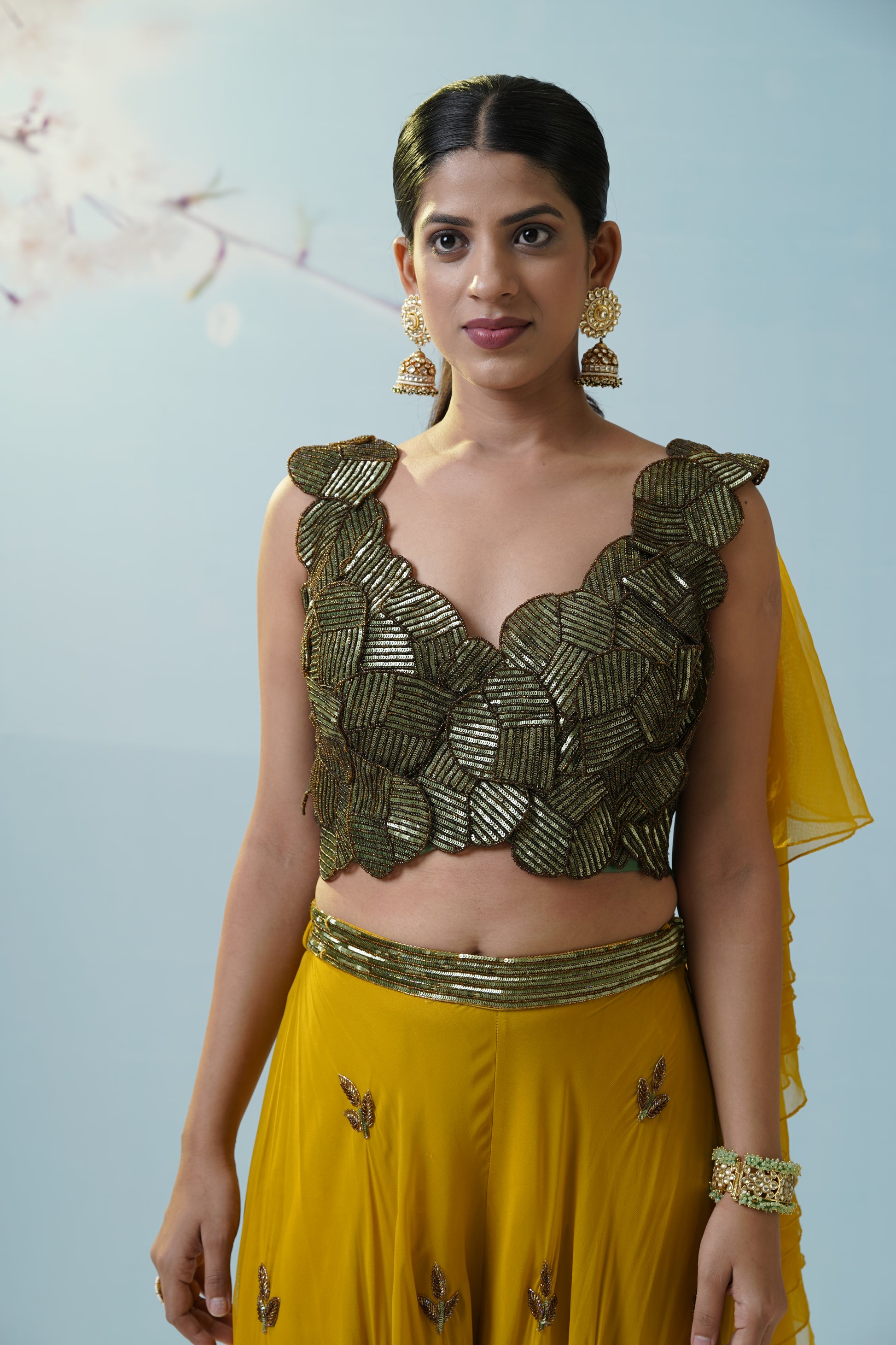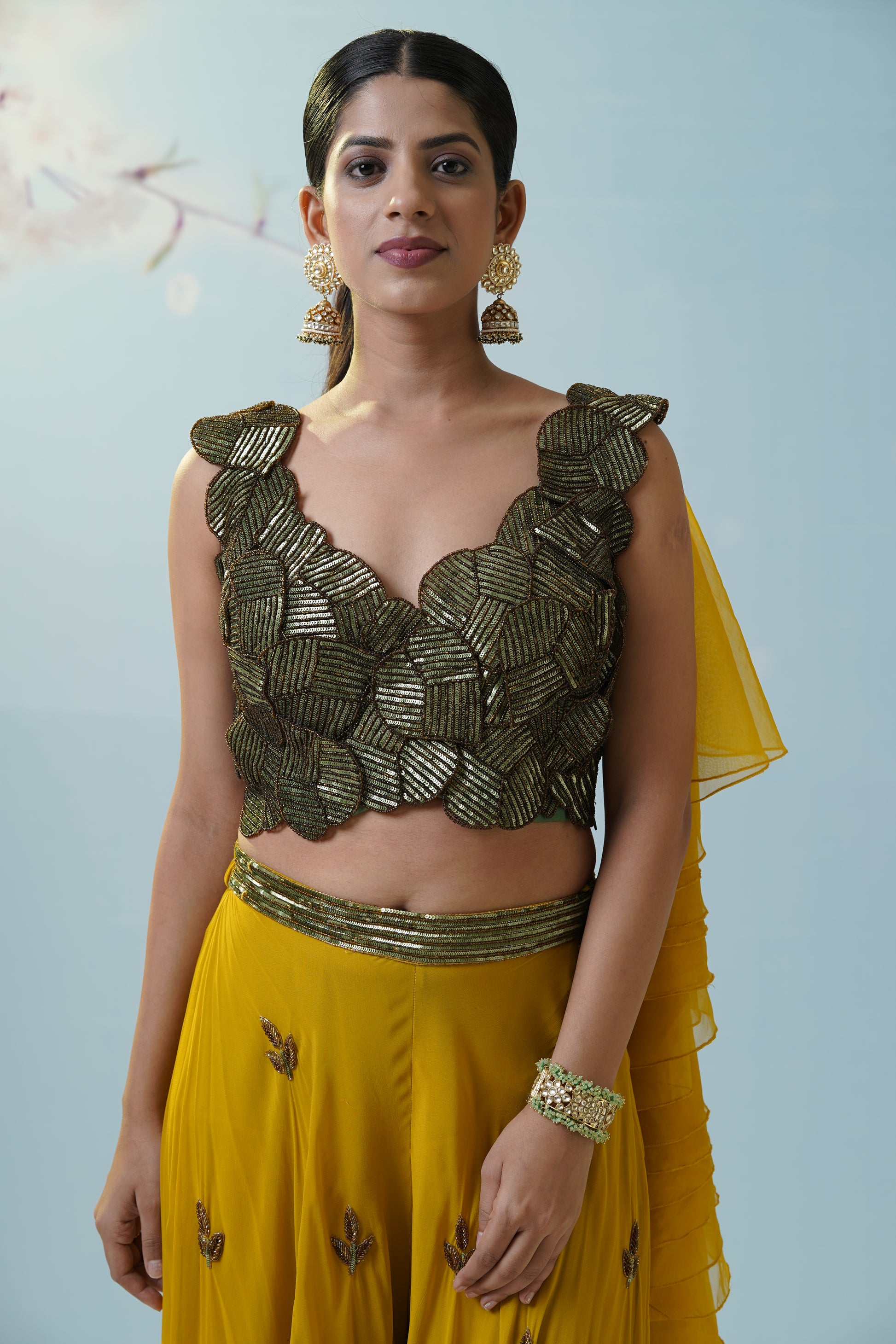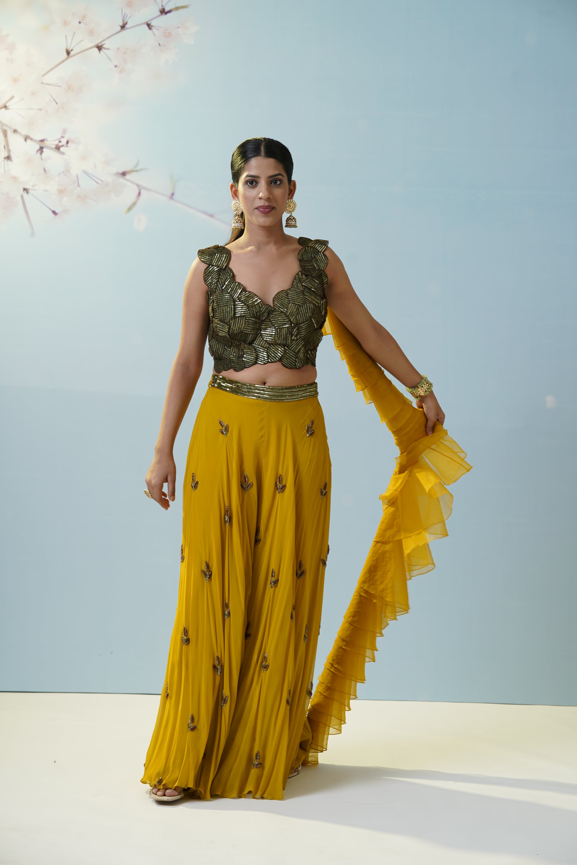 Vibrant mustard pleated palazzos adorned with delicate embroidery, complemented by a textured black crop top and matching dupatta for sangeet or festive galas. Effortlessly command attention with bold color and expressive detail. Designed for movement, this set is tailored for those who love to dance, celebrate, and express their unique persona. The statement mustard color radiates positivity while the embellished palazzos create fluid drama. Accessorize with chunky bracelets and a bold lip for an irresistible finish.