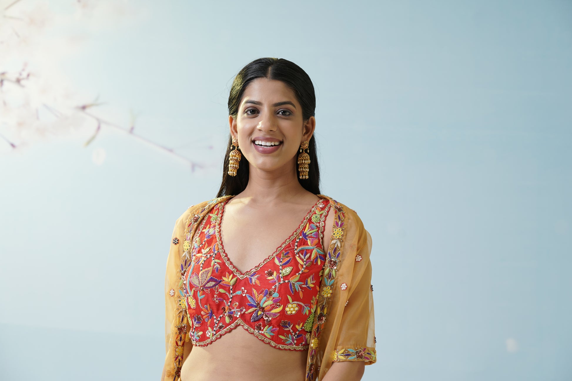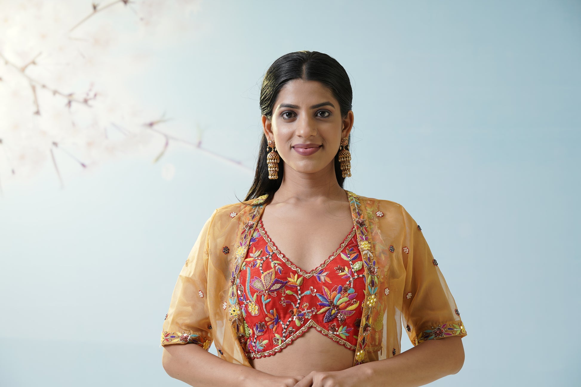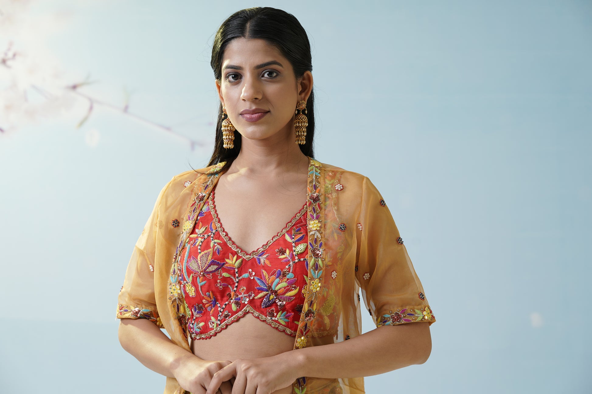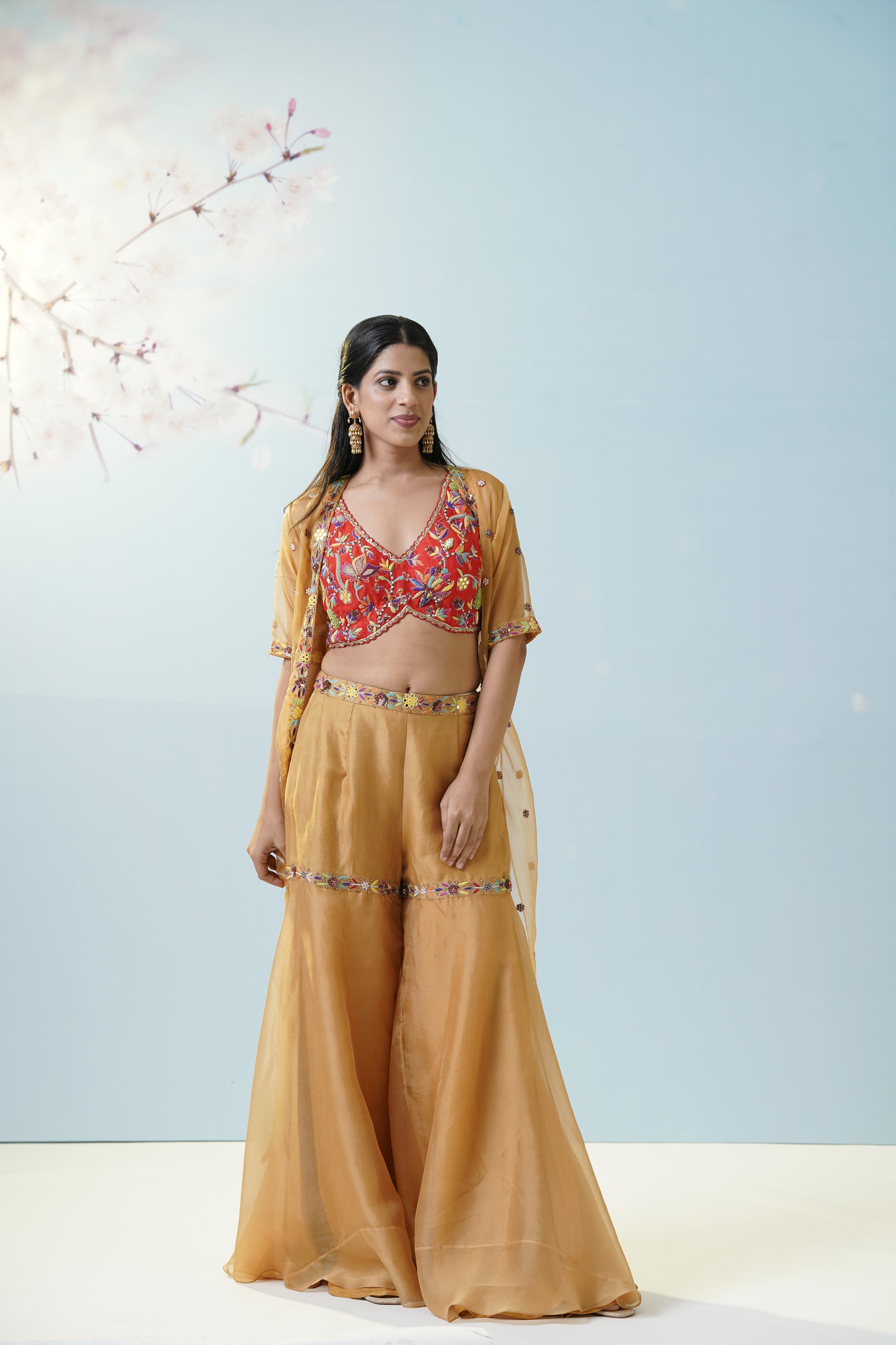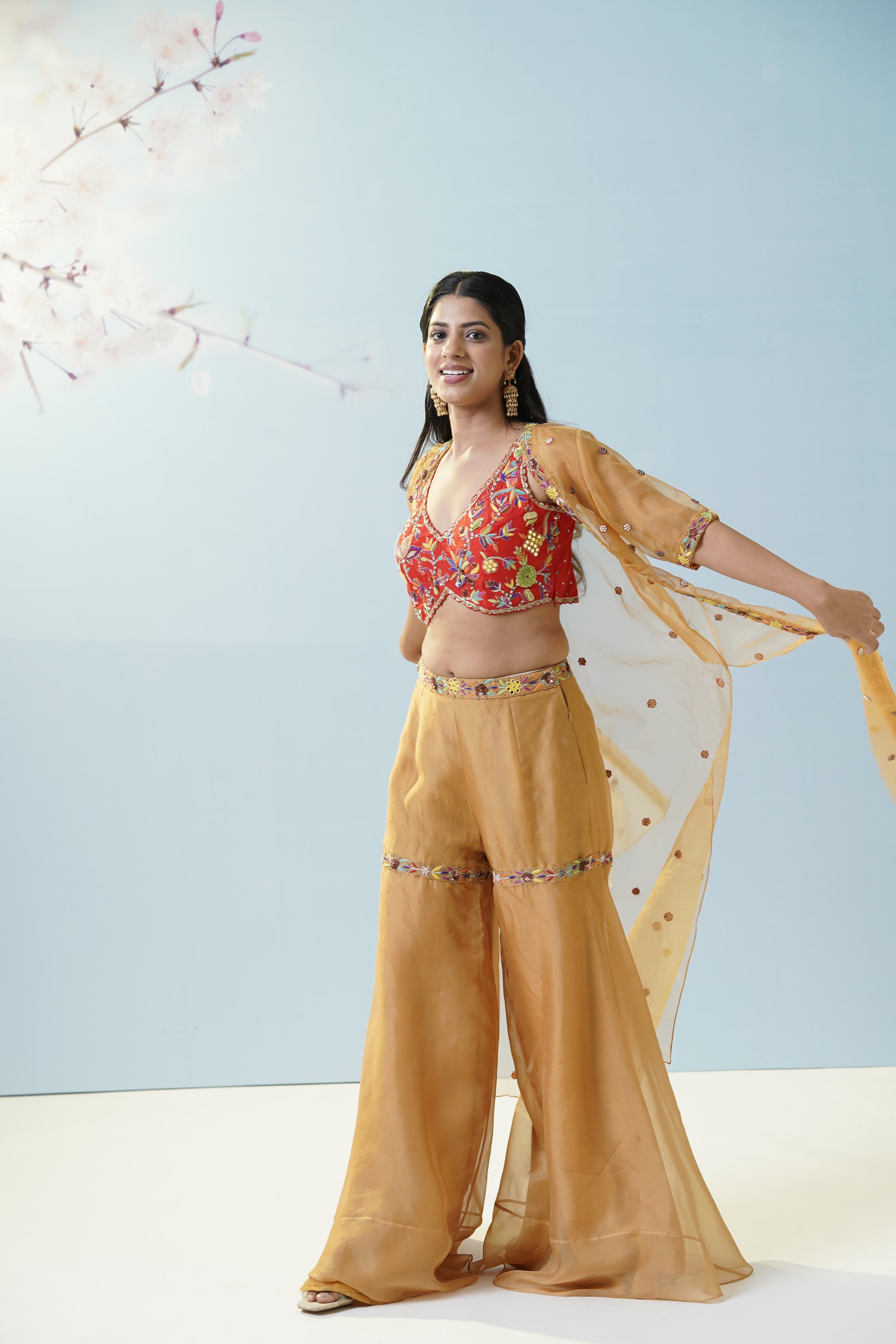 This striking set features wide-legged ochre yellow sharara pants paired with a vibrant pink blouse richly adorned in delicate embroidery. The blouse showcases detailed thread work with bead and sequin highlights, creating bold floral and geometric patterns that pop against the pink base. The sharara pants are crafted from a soft georgette fabric, giving the silhouette a breezy, contemporary flair while maintaining comfort and ease of movement. Completing the ensemble is a sheer matching dupatta, lightly embellished to echo the ornate details of the blouse. Designed to stand out at festive occasions, mehendi, or sangeet, this set beautifully balances traditional handwork and modern color contrasts for a truly show-stopping ethnic look.