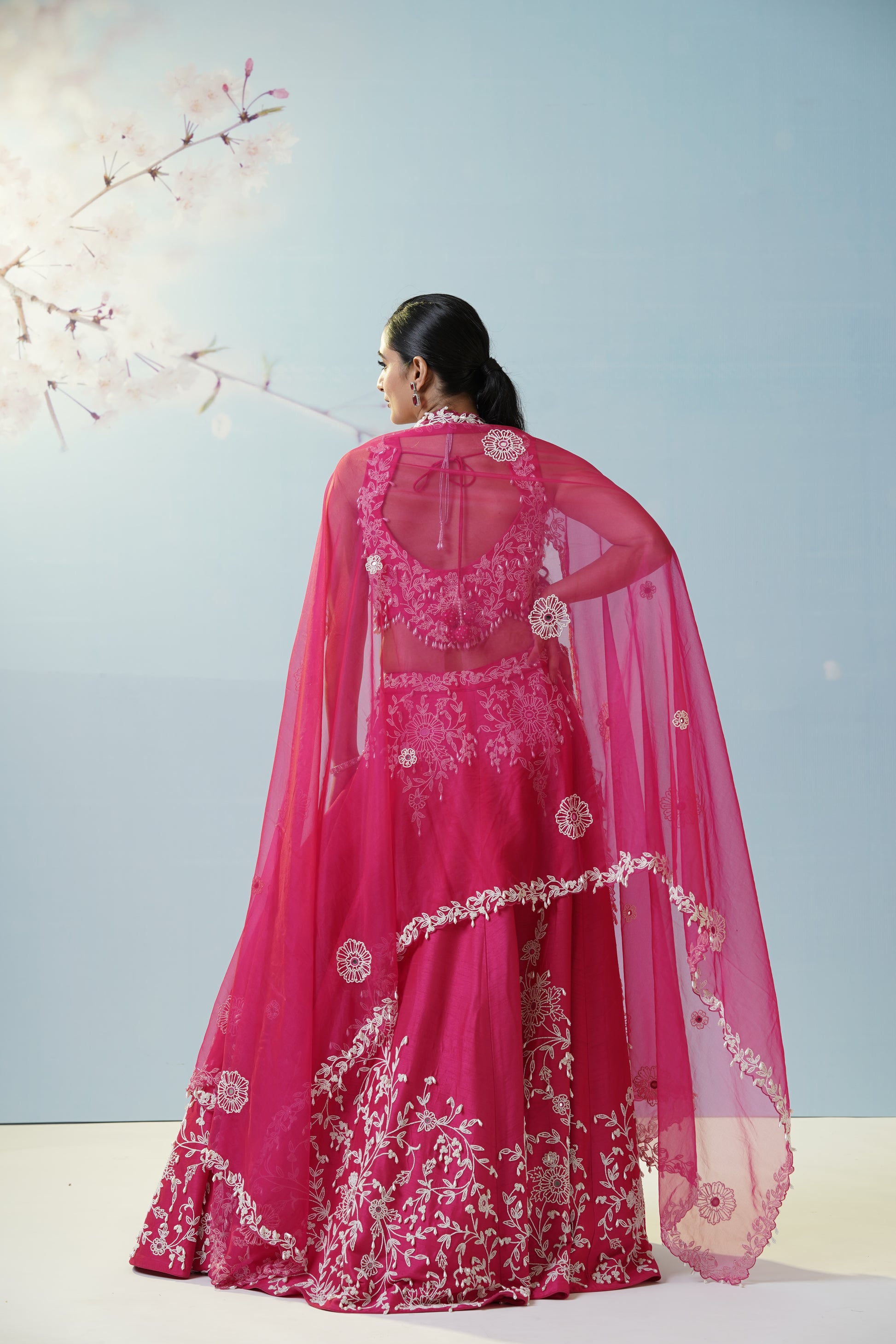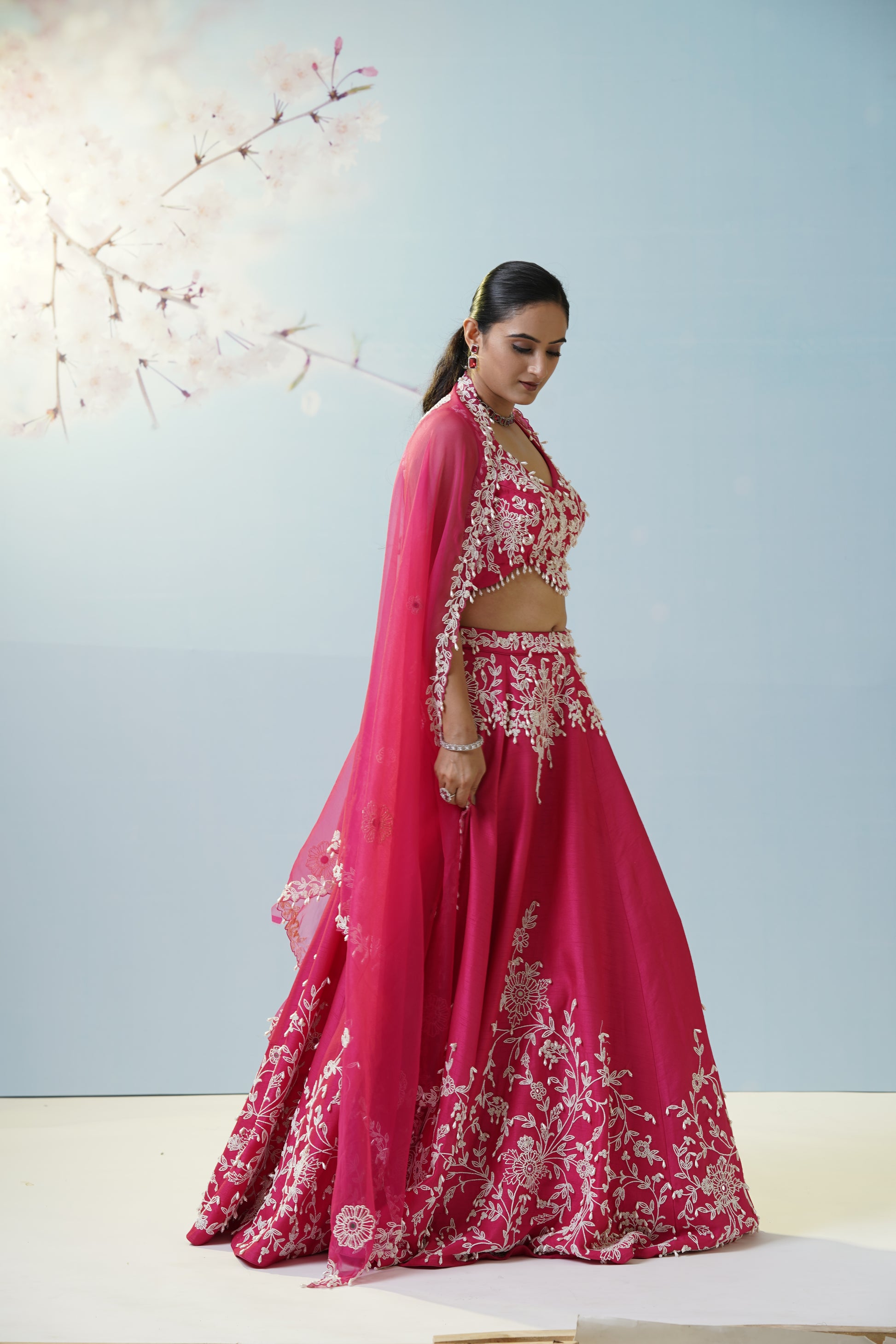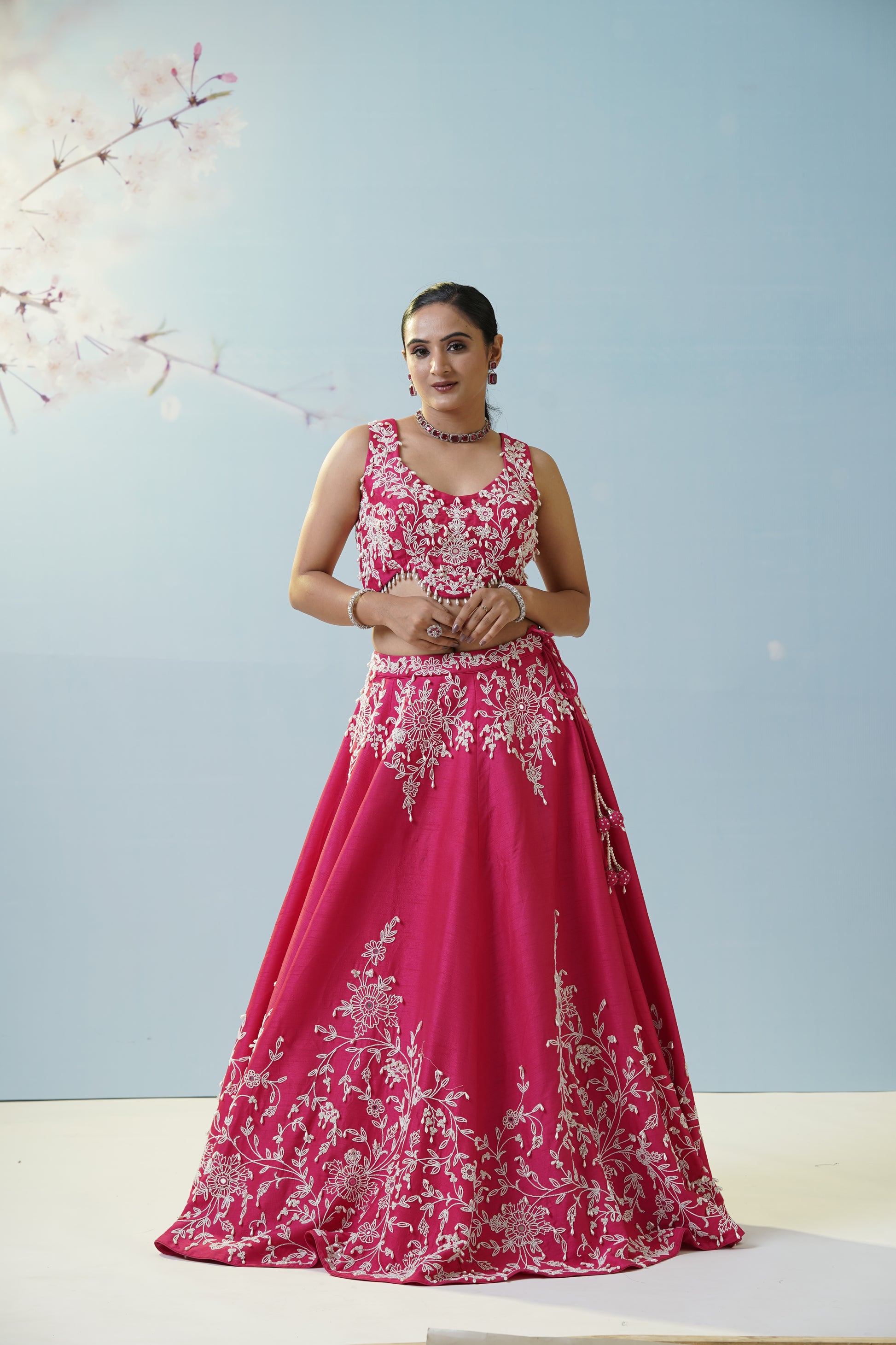 A stunning magenta lehenga, richly adorned with white embroidery, channels classic elegance and sophistication—an ideal choice for receptions or formal family occasions. Spark conversations and turn heads with sophisticated charm. Timeless craftsmanship paired with a striking silhouette ensures unforgettable photo moments and a legacy of style. The precise floral detailing on the fabric adds artisanal beauty and luxury appeal to the ensemble. This gown radiates confidence and makes every entrance feel like a red-carpet moment.