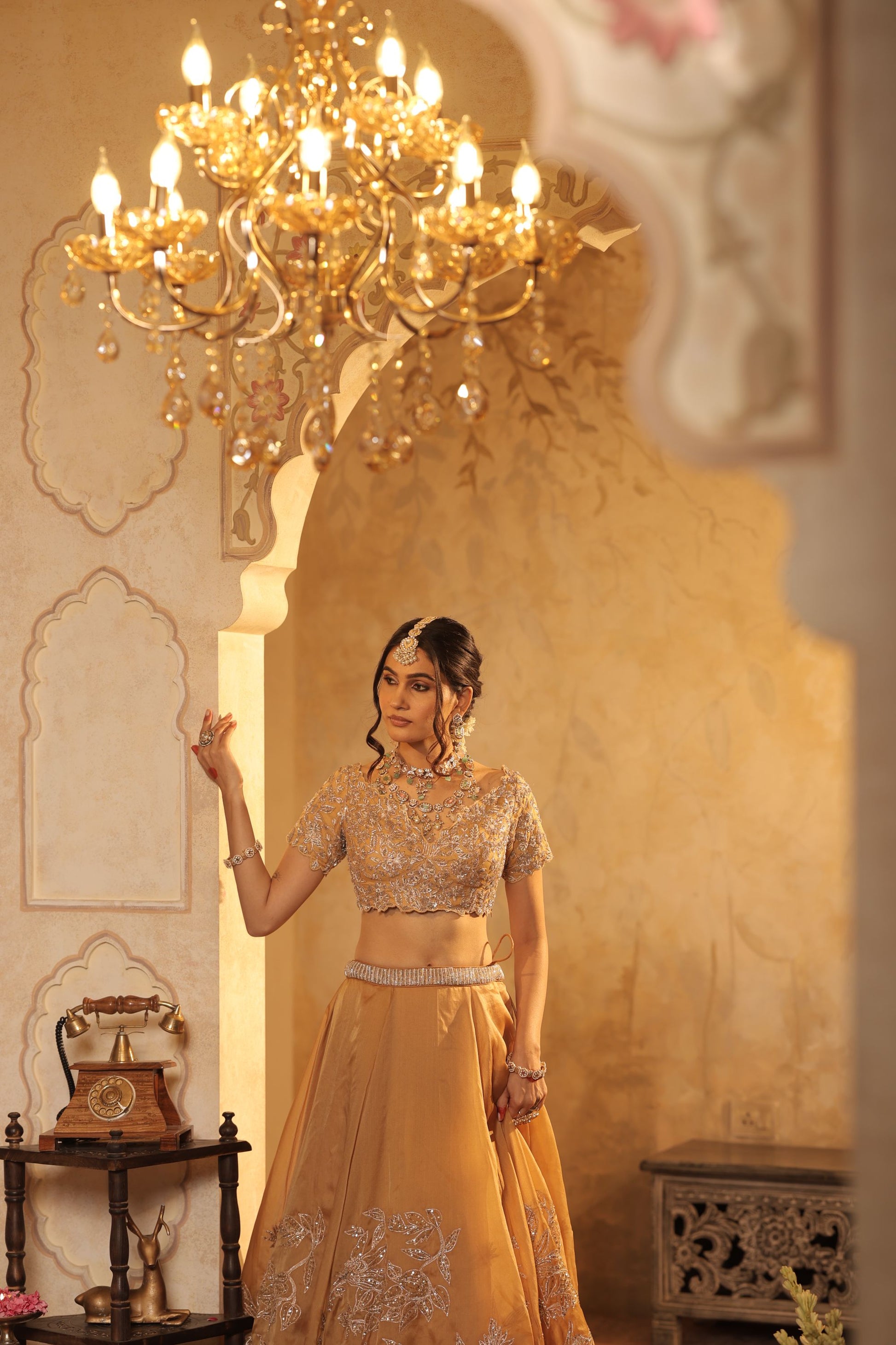 Exuding luxury, this gold embellished skirt set is adorned with sparkling accents and fine embroidery. The cropped blouse and flowing skirt blend tradition with modernity for a truly standout festive look.