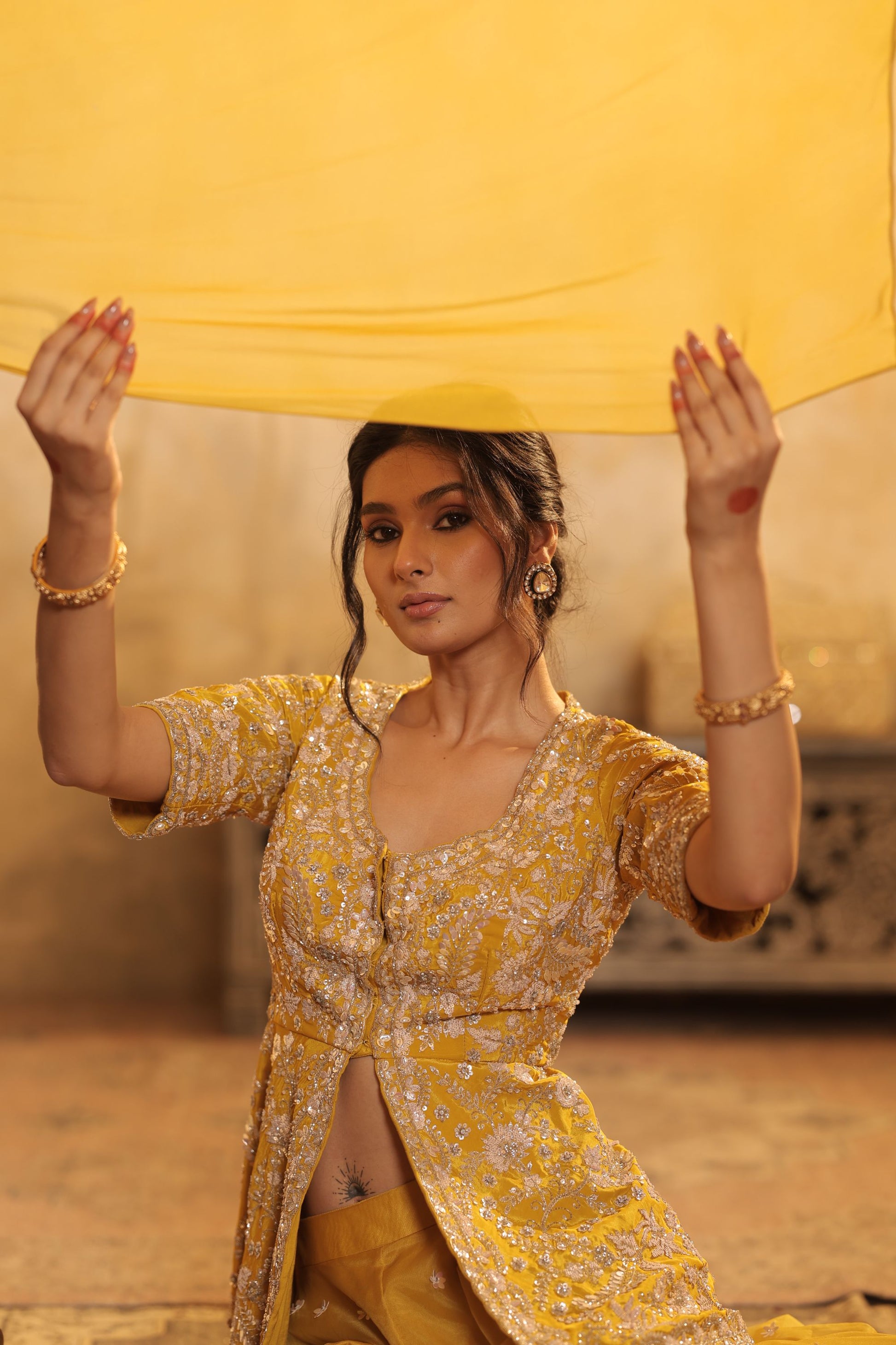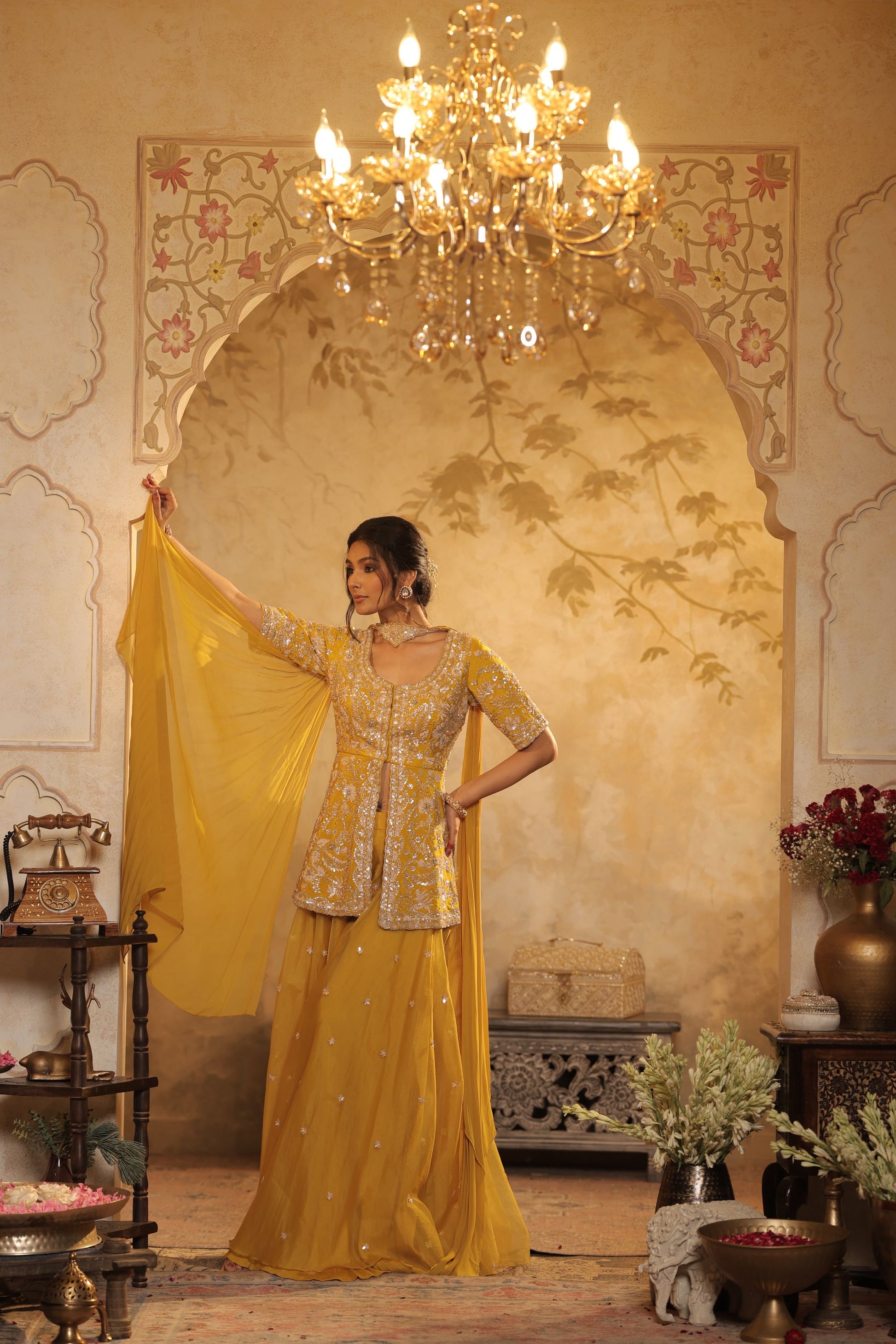 Radiate sunshine and celebration in this vibrant yellow sharara set, exquisitely embellished with sparkling sequins and intricate embroidery. The structured top and flowing bottoms come together for a look that’s bold, festive, and unforgettable.