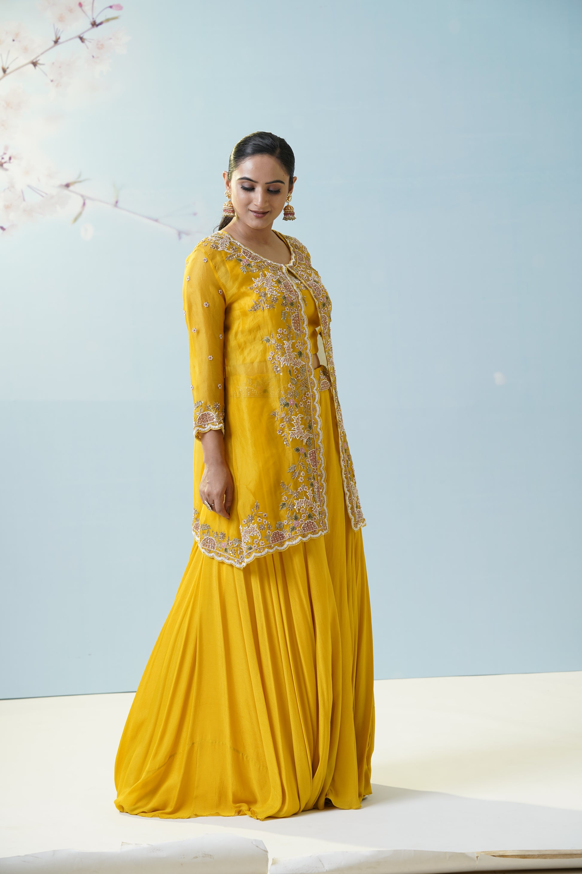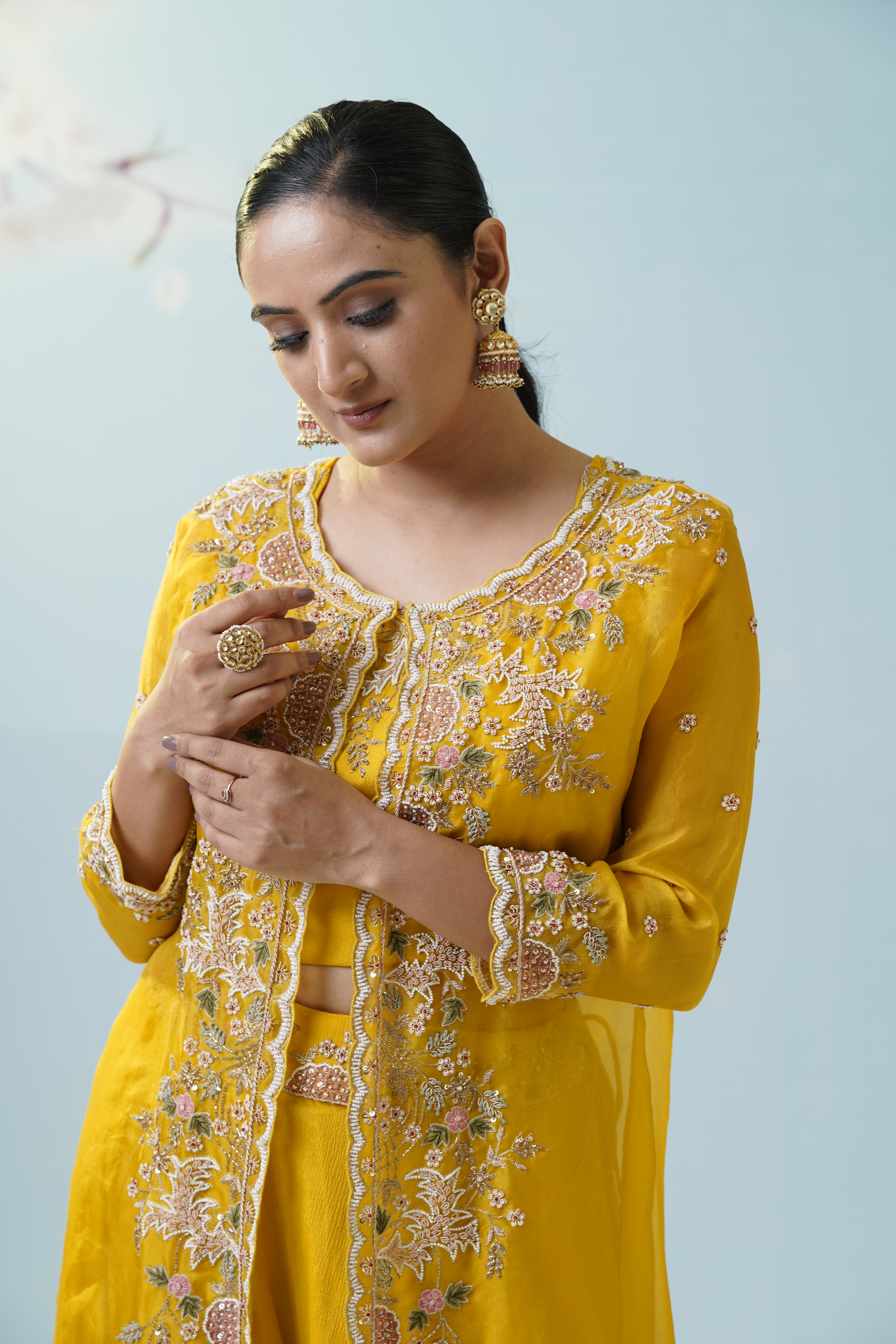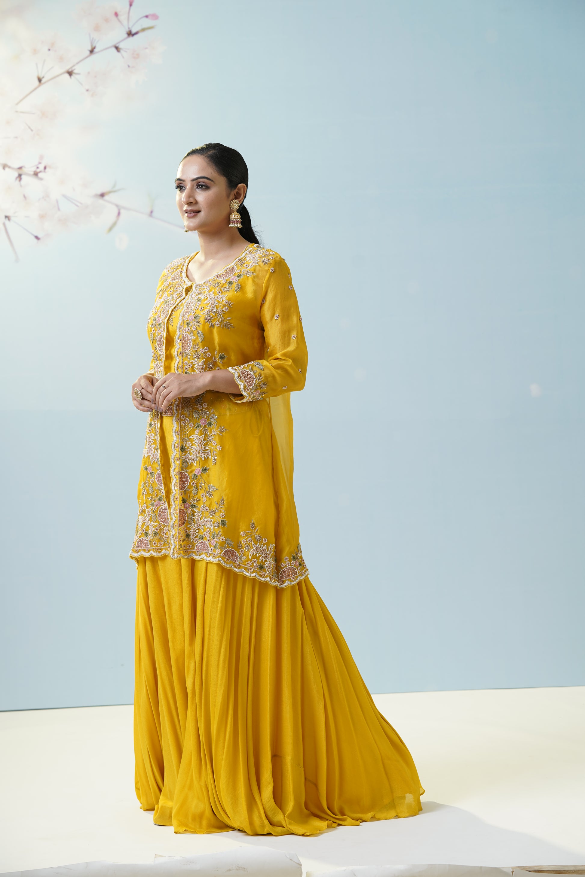 This mustard yellow ensemble consists of a flared sharara pant and a coordinating kurti, heavily adorned with intricate cutdana and thread embroidery. The kurti features front-open styling with ornate floral and paisley motifs embellished in metallic sequins, beads, and cutdana work that lend a regal touch. The sharara is crafted in georgette fabric, offering volume and easy movement. The embroidery is highlighted with delicate zari and resham threads, scattered crystals, and beads that catch the light beautifully. Perfect for haldi ceremonies, sangeet events, or wedding parties, this set stands out for its luxurious embroidery and festive charm.